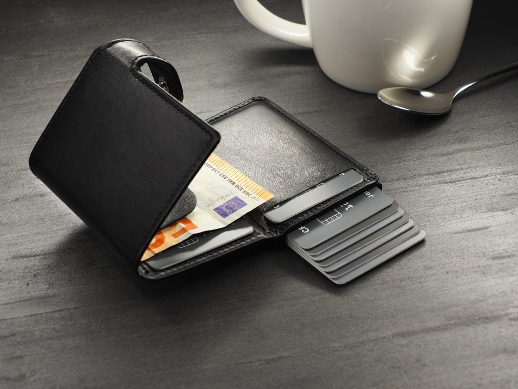 Vejde se do ní až 9 karet a má také kapsy na bankovky i mince. Peněženka disponuje speciálním mechanismem postupného vysouvání, díky čemuž máte vmžiku po ruce požadovanou kartu.