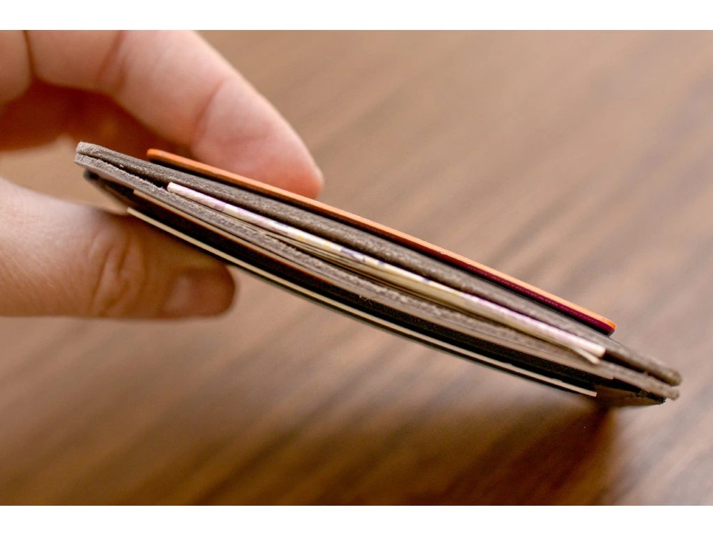 Cardholder má po stranách dvě přihrádky s výřezem pro snadný přístup ke kartám (ID formát). Uvnitř se nachází prostor vhodný například pro složené bankovky. Celkově pojme přibližně 5–8 karet.