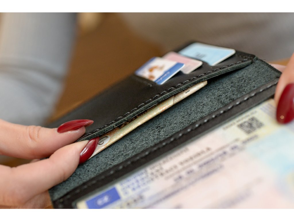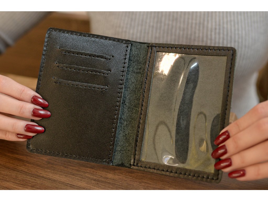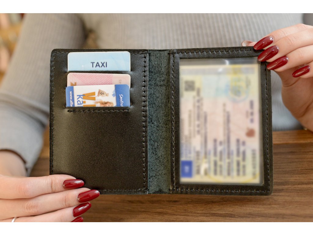 Na levé straně se nacházejí tři přihrádky na plastové karty formátu ID (například řidičský průkaz, pojištění nebo Karta pro přístup na parkoviště letiště). Pod kartami je umístěna skrytá kapsa, vhodná pro složené bankovky nebo doplňkové dokumenty. Pravá strana obsahuje průhledné okénko, které je vhodné pro technický průkaz vozidla.