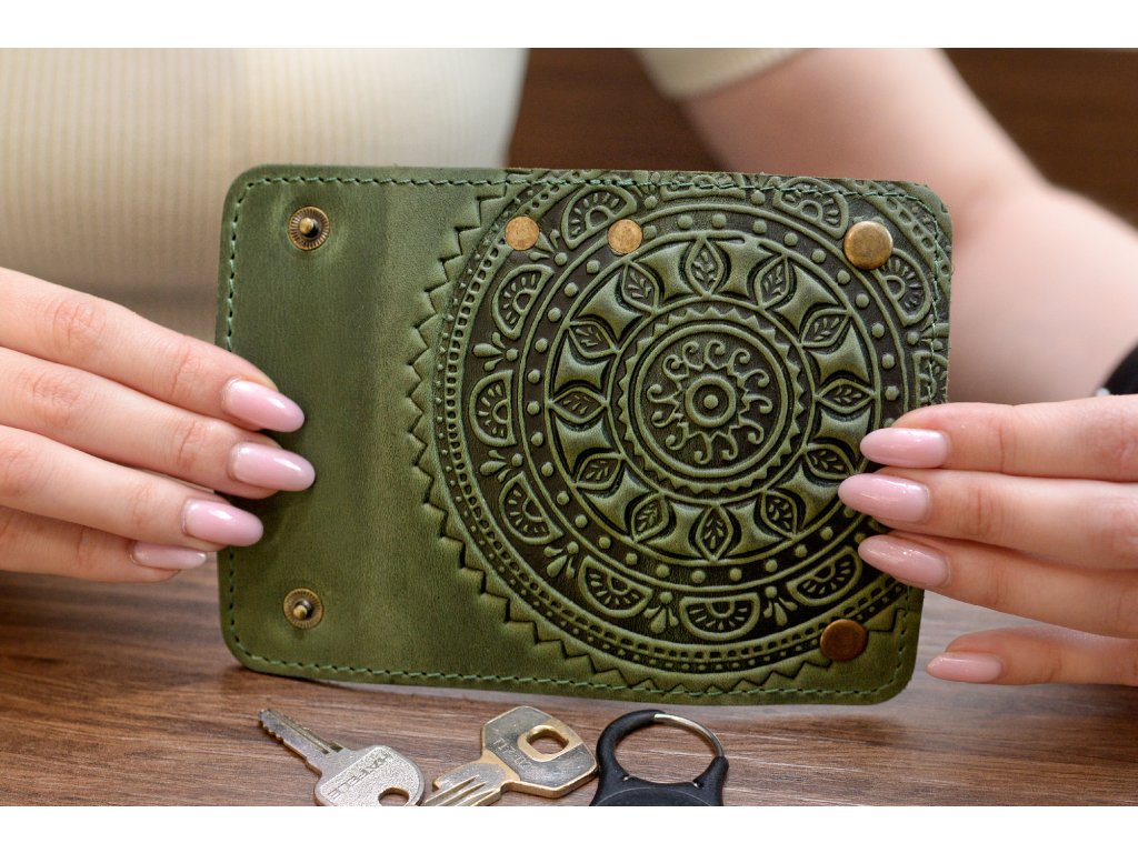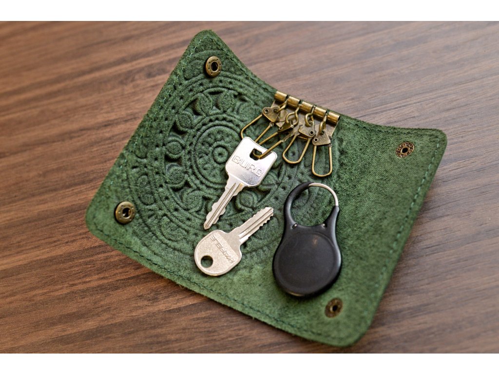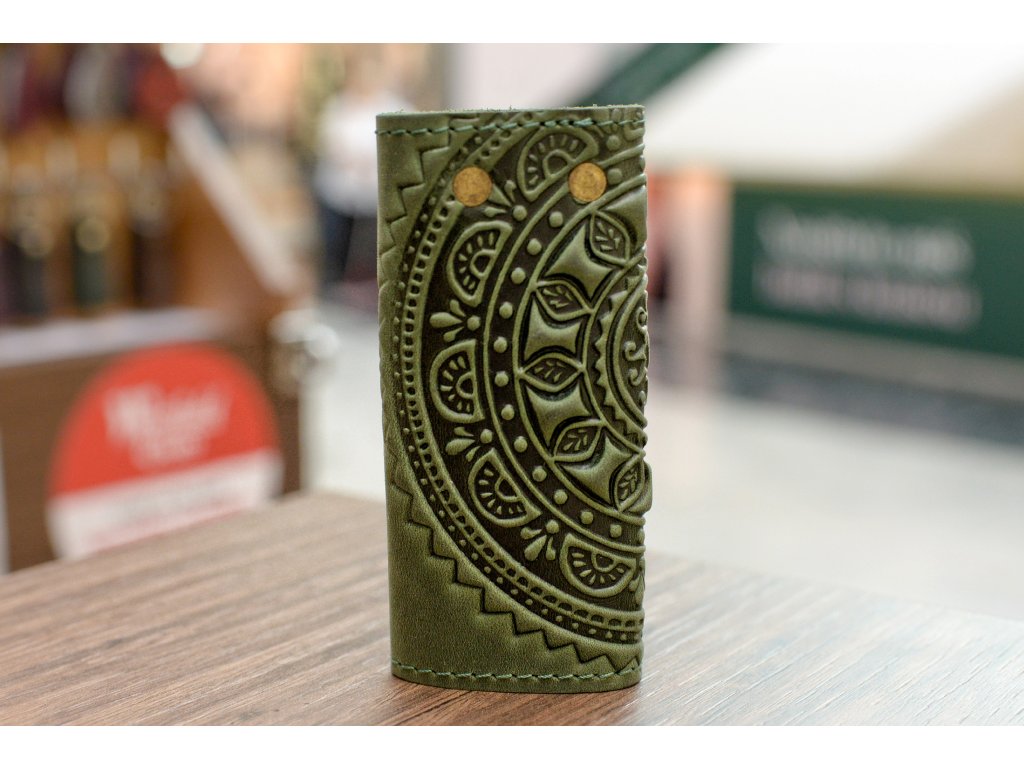 Držák na klíč(4) s reliéfem "MANDALA". Kůže "Crazy Horse" smaragdová