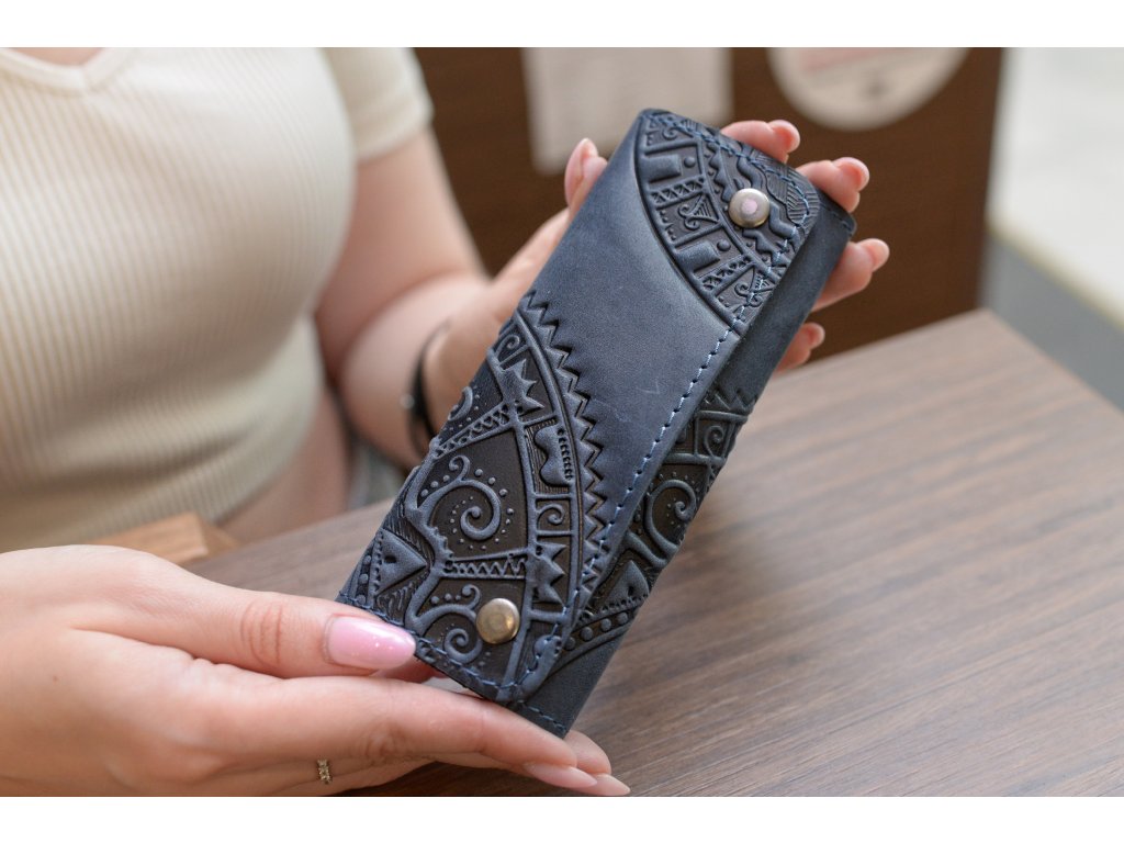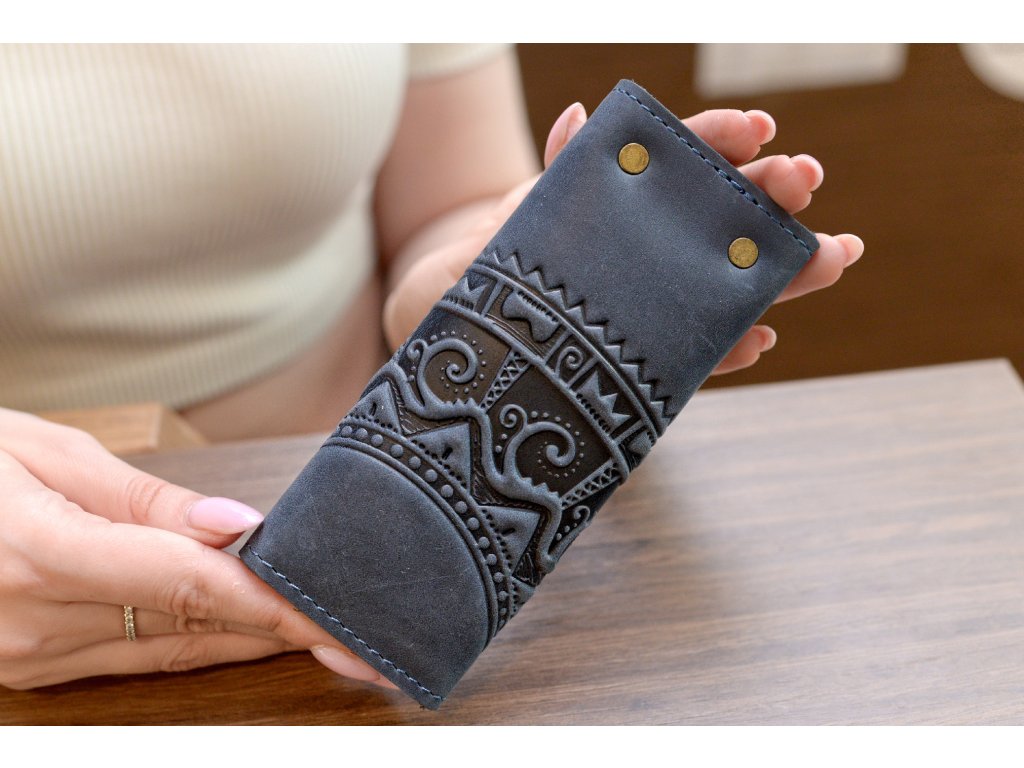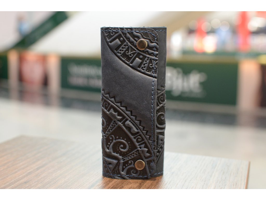Držák na klíč(6) s reliéfem "HUCUL". Kůže "Crazy Horse" tmavě modrá