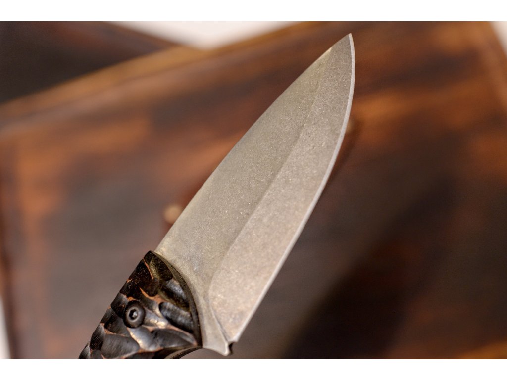Nůž s čepelí z oceli 50Х14МФ (X50CrMoV15) s tvrdostí 58 HRC, odolnou vůči korozi a opotřebení. Rukojeť z dubu s efektem lámaného kamene.