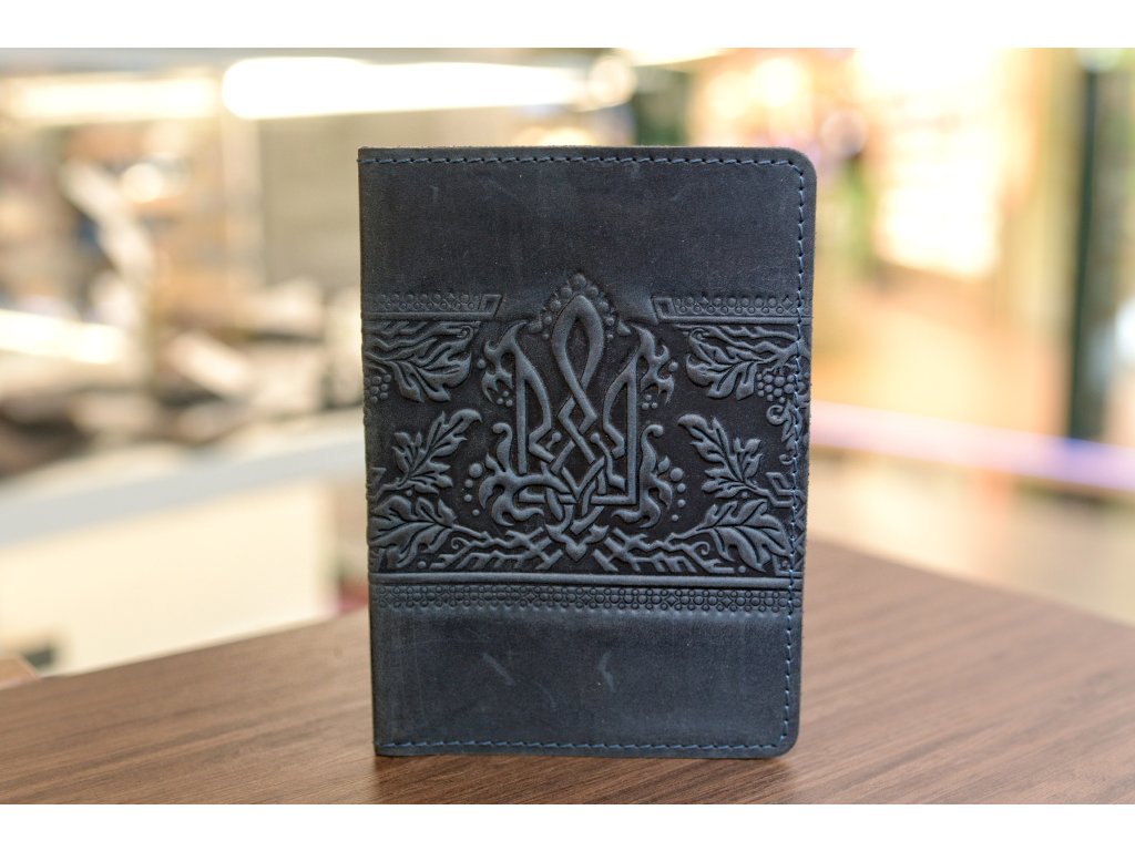 Obal na PAS s reliéfem "Trojzubec-GR". Kůže "Crazy Horse" tmavě modrá