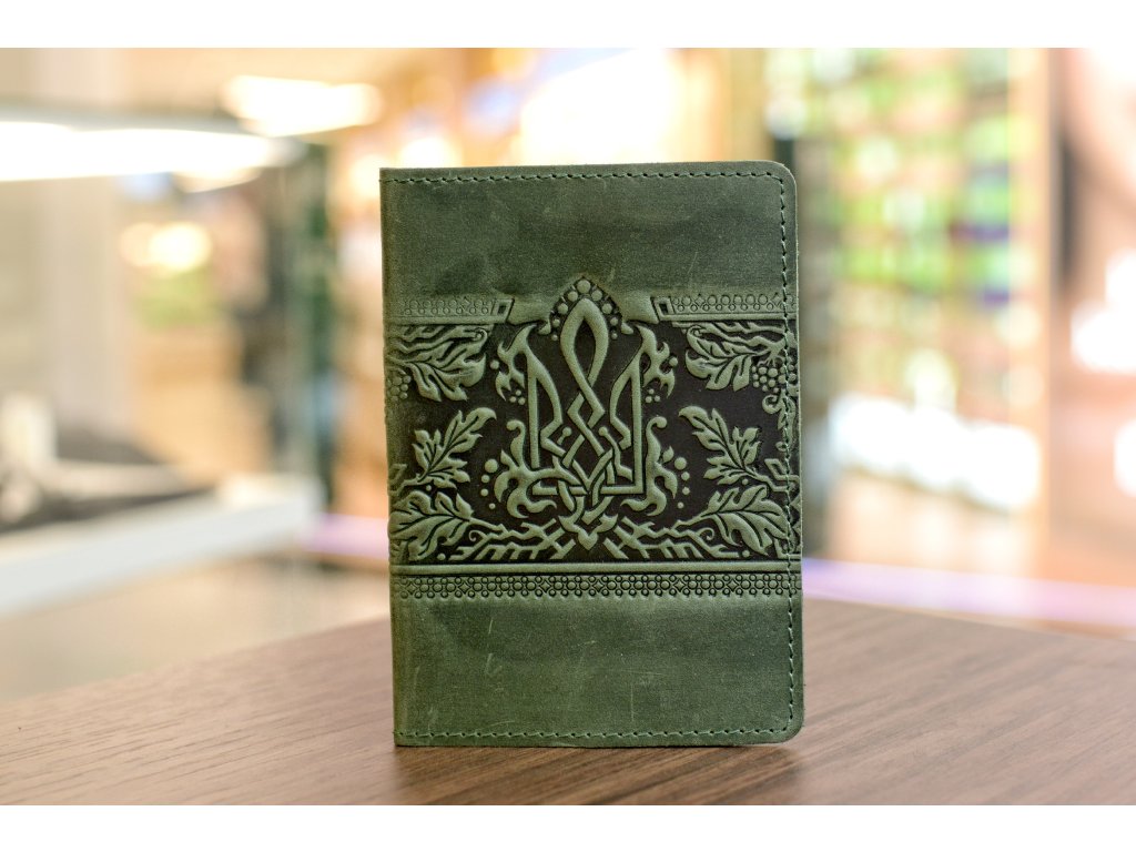 Obal na PAS s reliéfem "Trojzubec-GR". Kůže "Crazy Horse" smaragdová