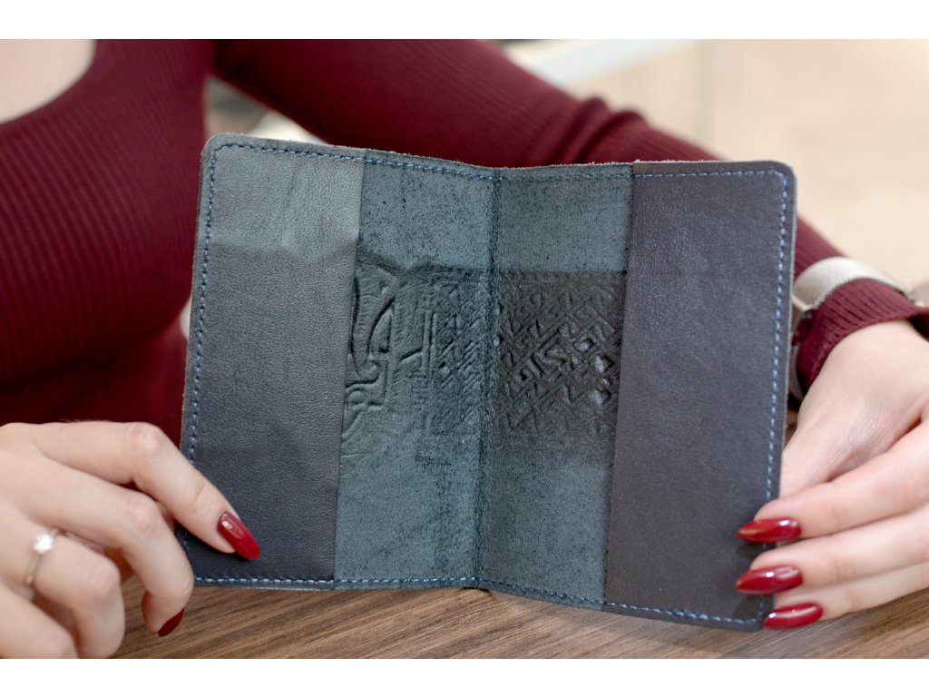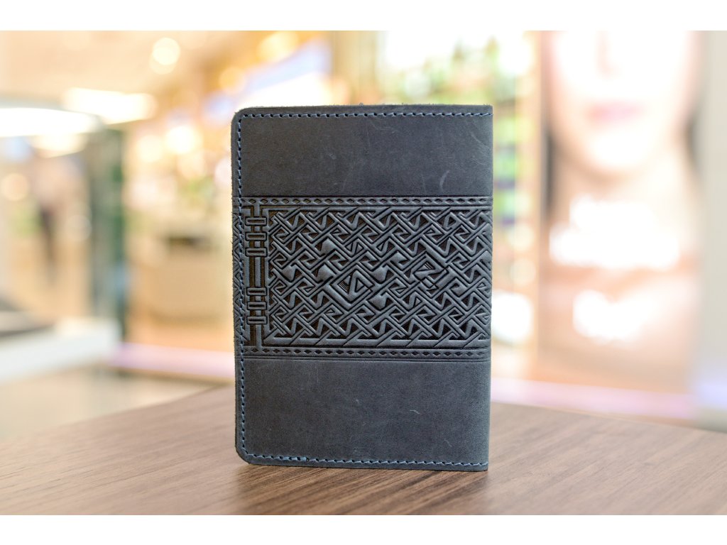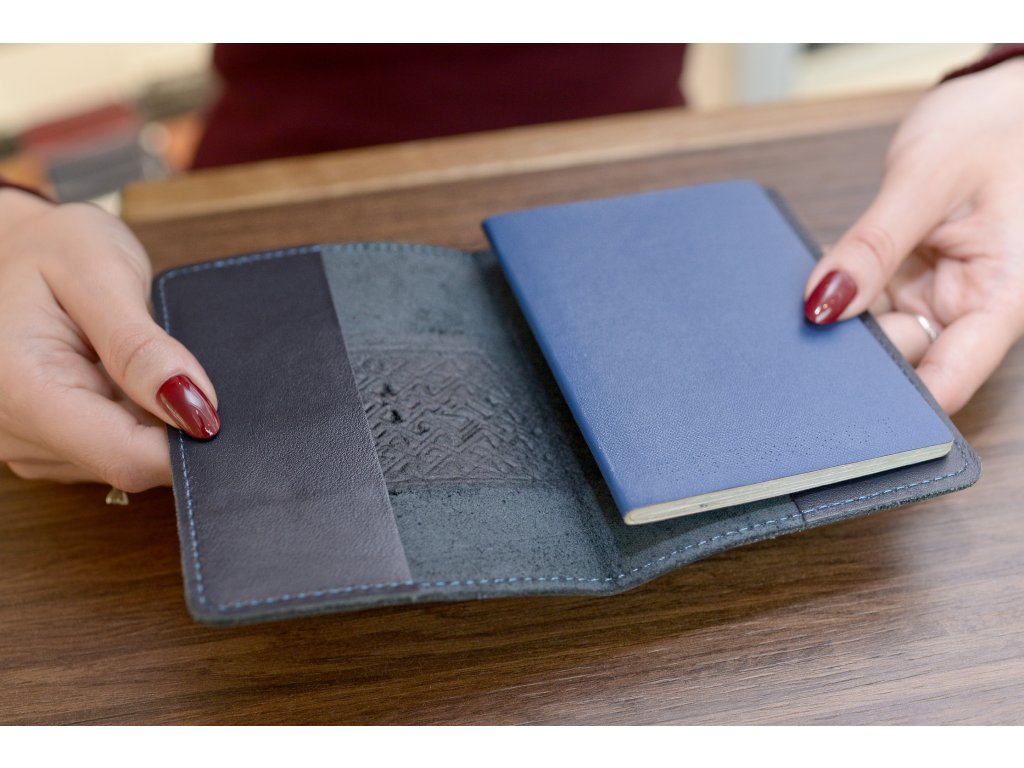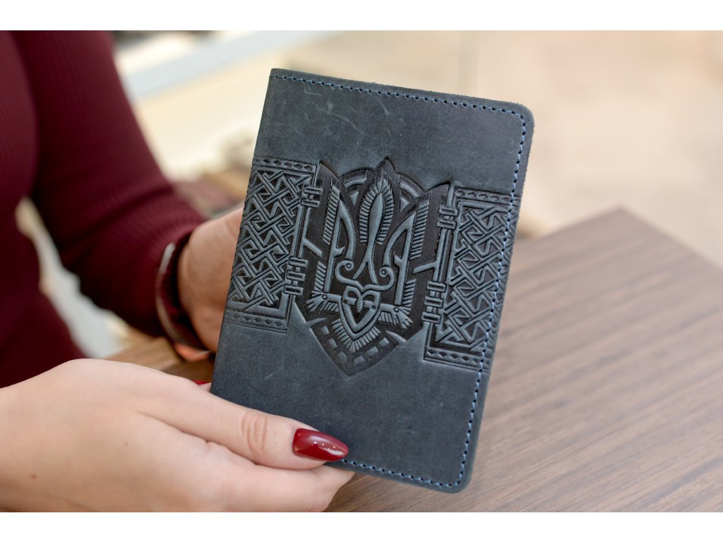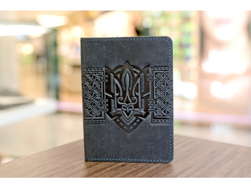 Obal na PAS s reliéfem "Trojzubec-výšivka". Kůže "Crazy Horse" tmavě modrá