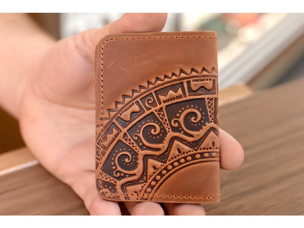 Organizátor na karty ID1+2,5 s reliéfem "Hutsul". Kůže "Crazy Horse" rezavá