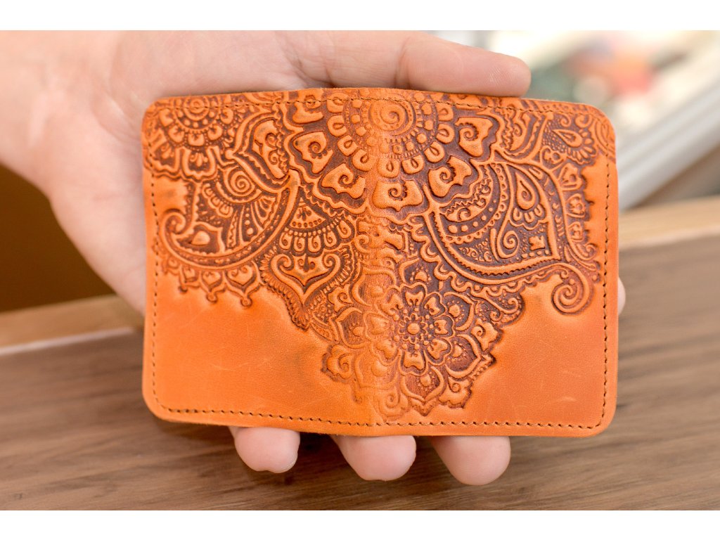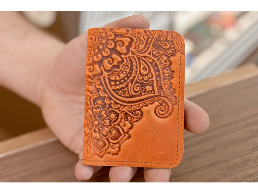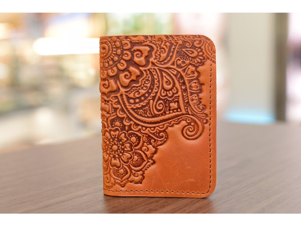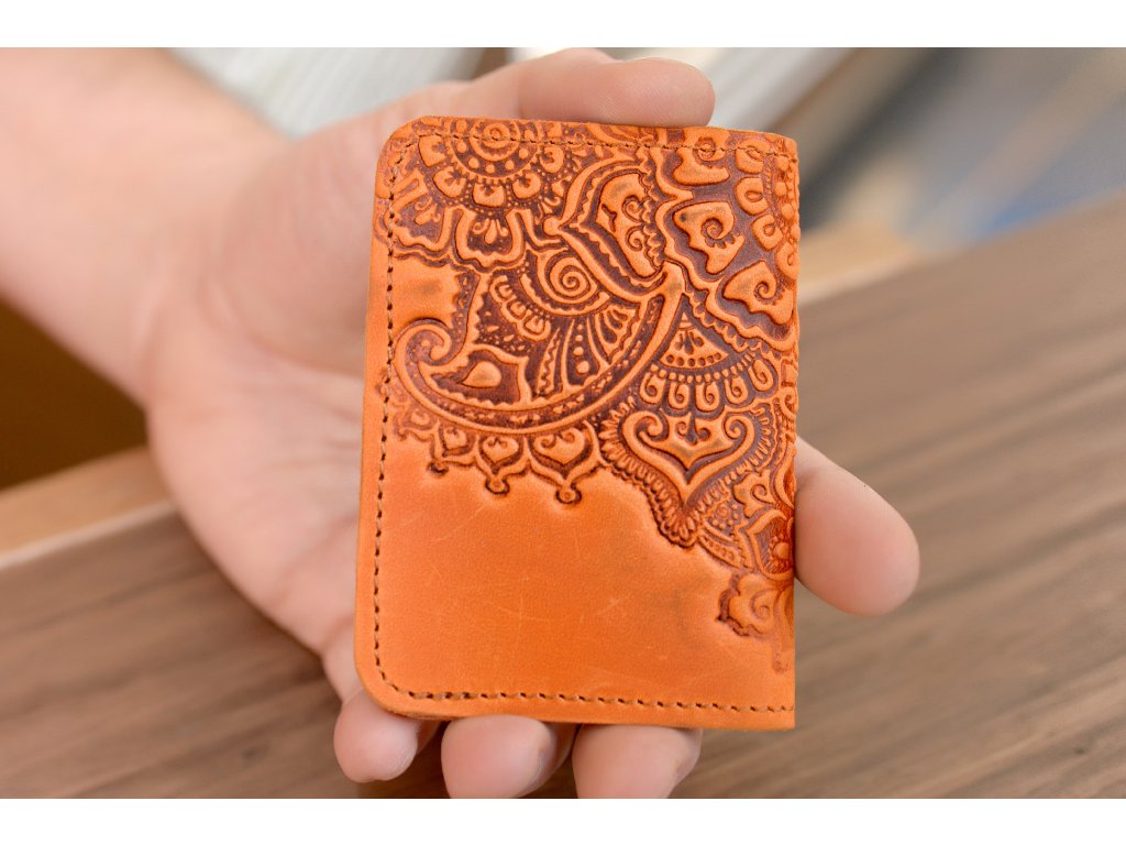 Organizátor na karty ID1+2,5 s reliéfem "Kvetoucí zahrada". Kůže "Crazy Horse" oranžová