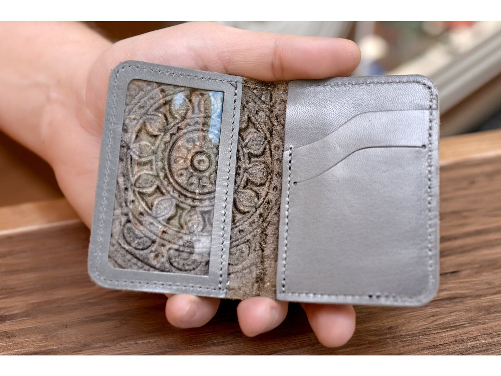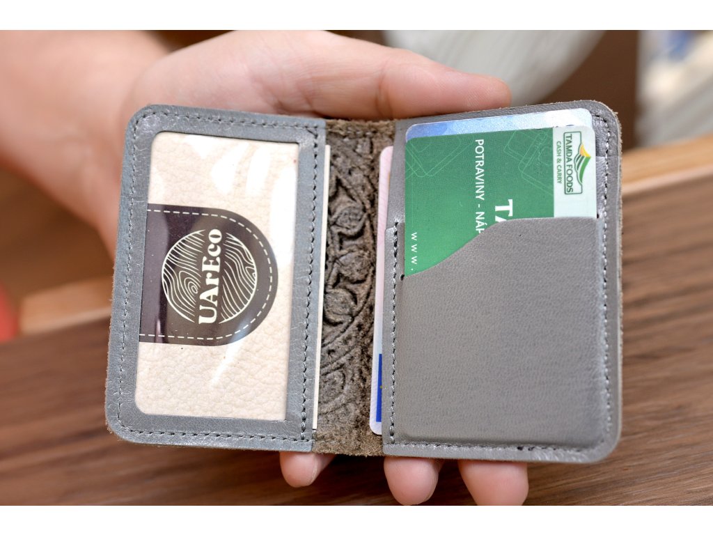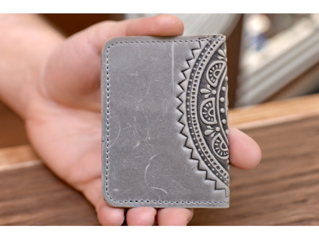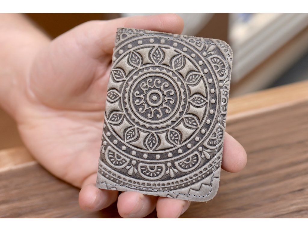 Organizátor na karty ID1+2,5 s reliéfem "Mandala". Kůže "Crazy Horse" šedá