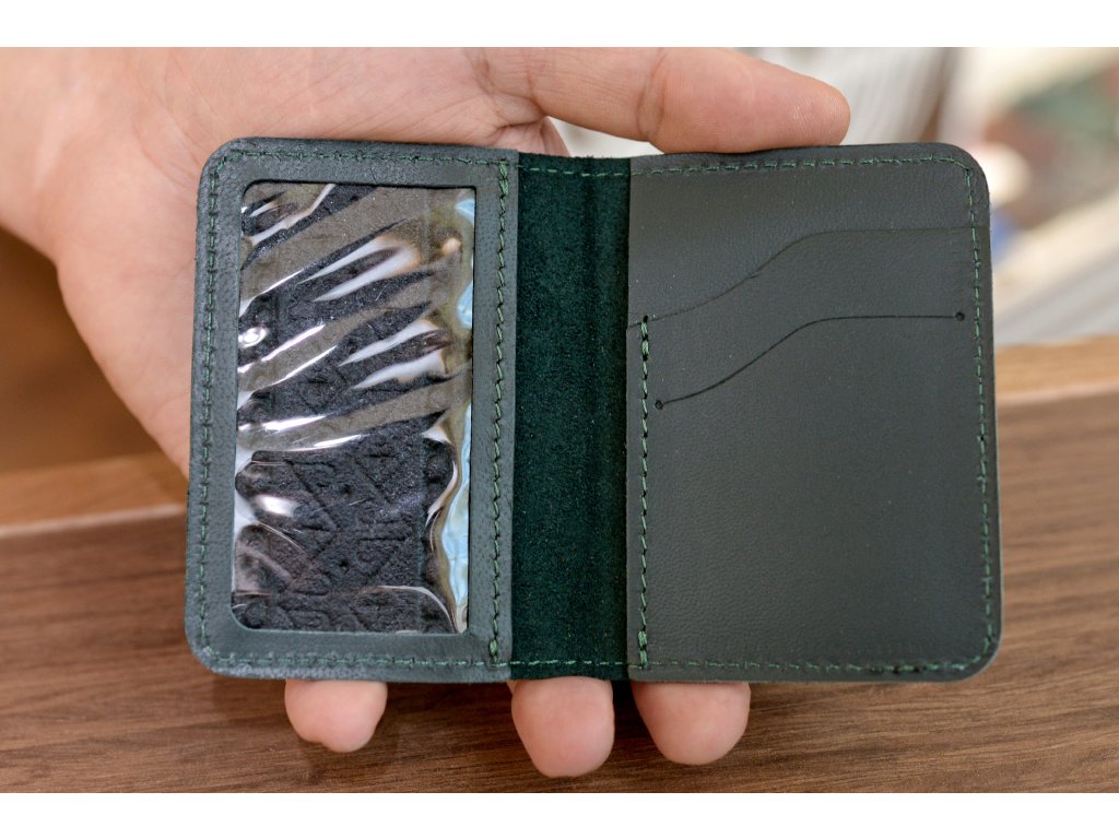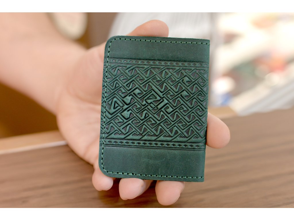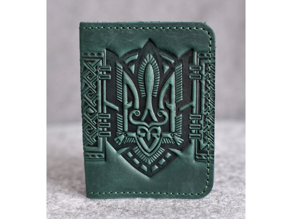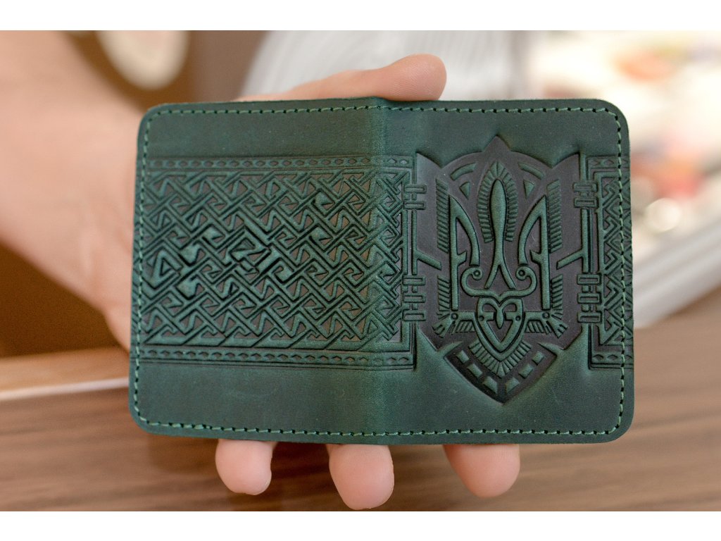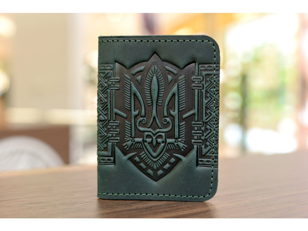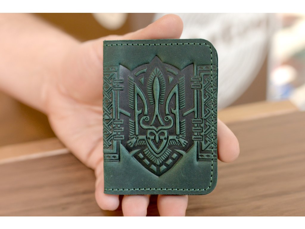 Organizátor na karty ID1+2,5 s reliéfem "Trojzubec-výšivka". Kůže "Crazy Horse" tm.zelená