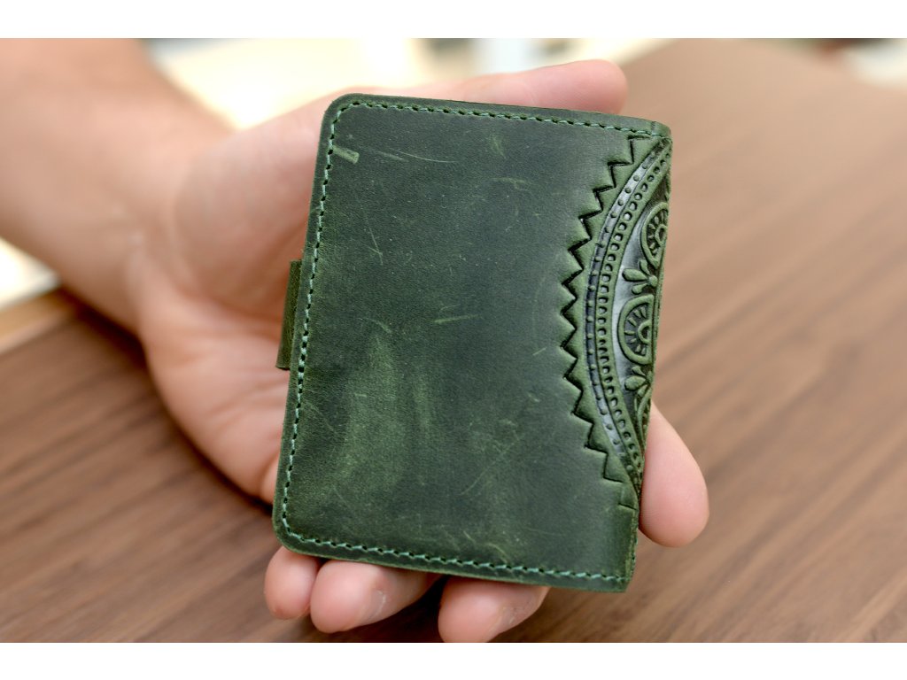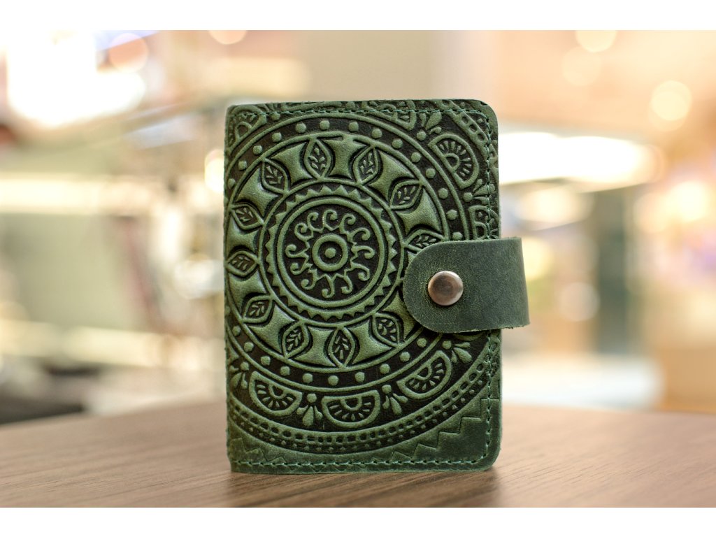 Organizátor na karty ID22 s reliéfem "Mandala". Kůže "Crazy Horse" smaragdová