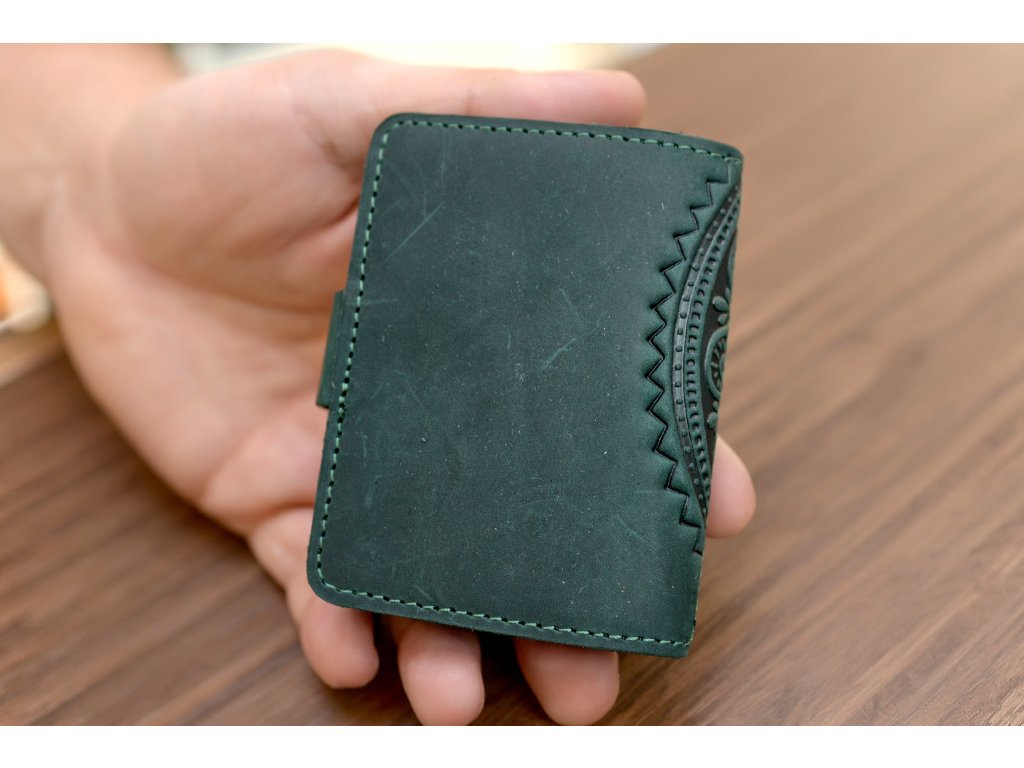 Organizátor na karty ID22 s reliéfem "Mandala". Kůže "Crazy Horse" tm.zelená