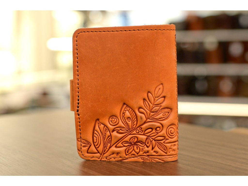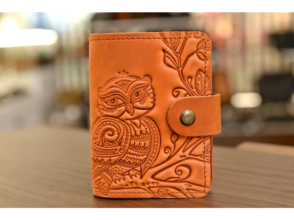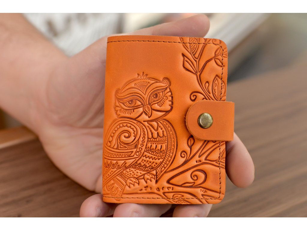 Organizátor na karty ID22 s reliéfem "Sovička". Kůže "Crazy Horse" oranžová