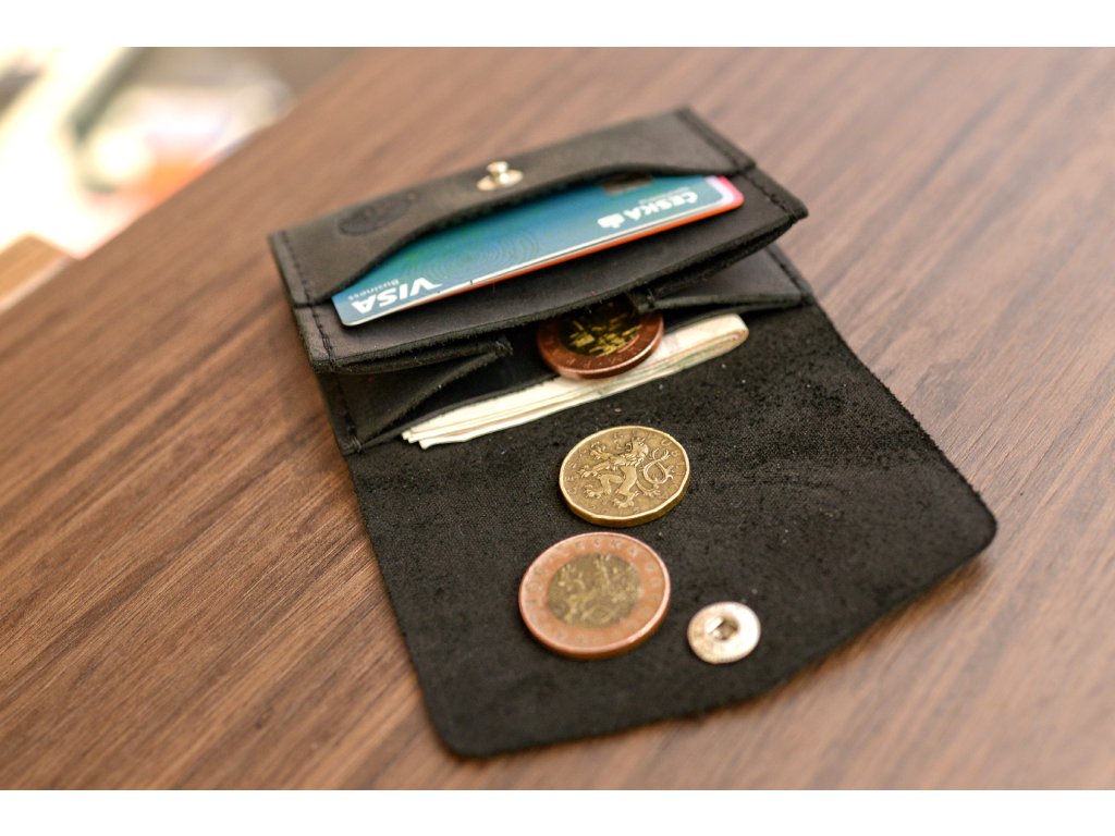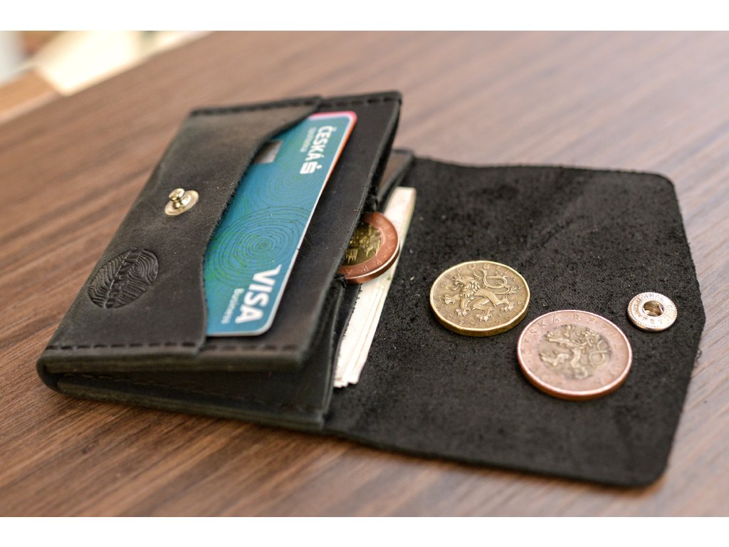 - Praktické rozvržení – Jedna kapsa na bankovky a/nebo mince, 2 kapsy na karty (každá pojme 2-3 karty)