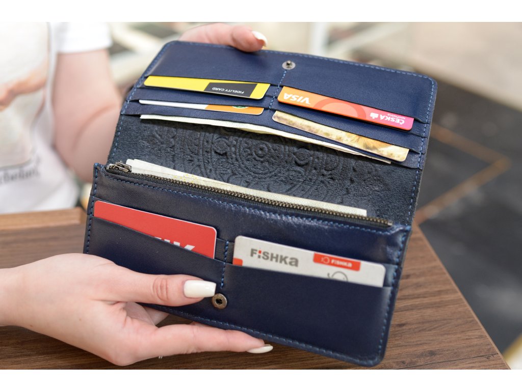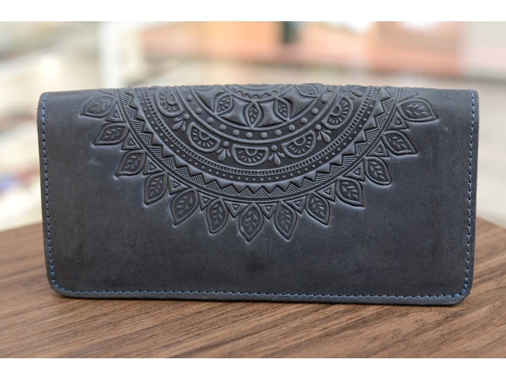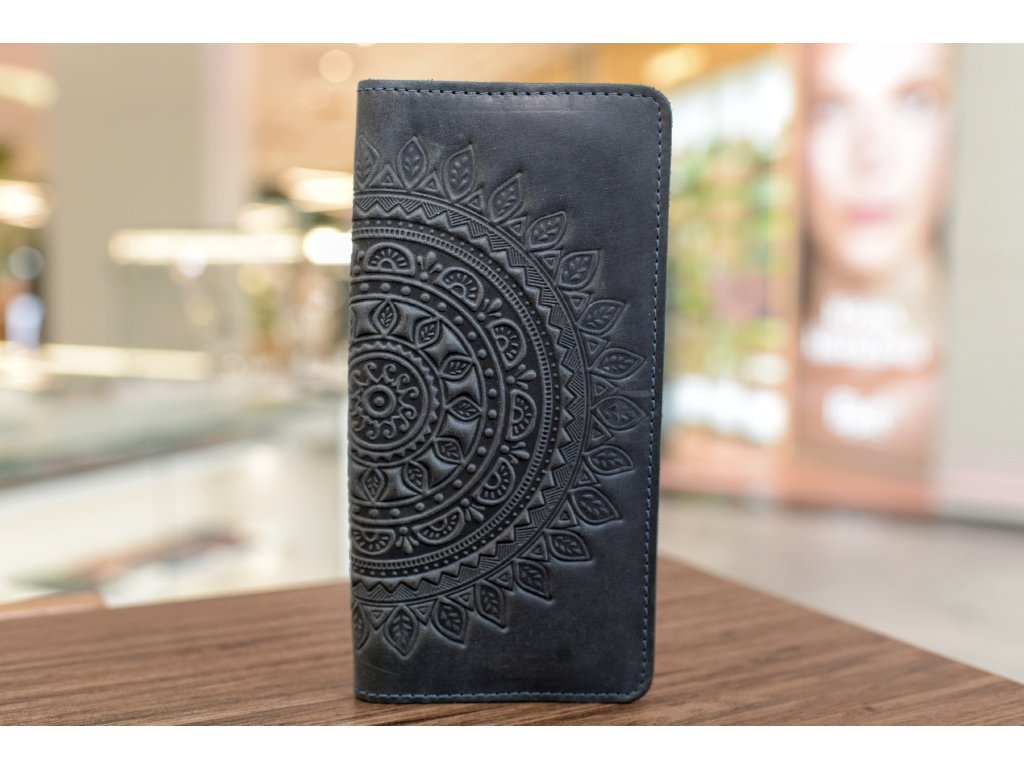 Peněženka-longer "Shpak" s reliéfem "Mandala". Kůže "Crazy Horse" tmavě modrá