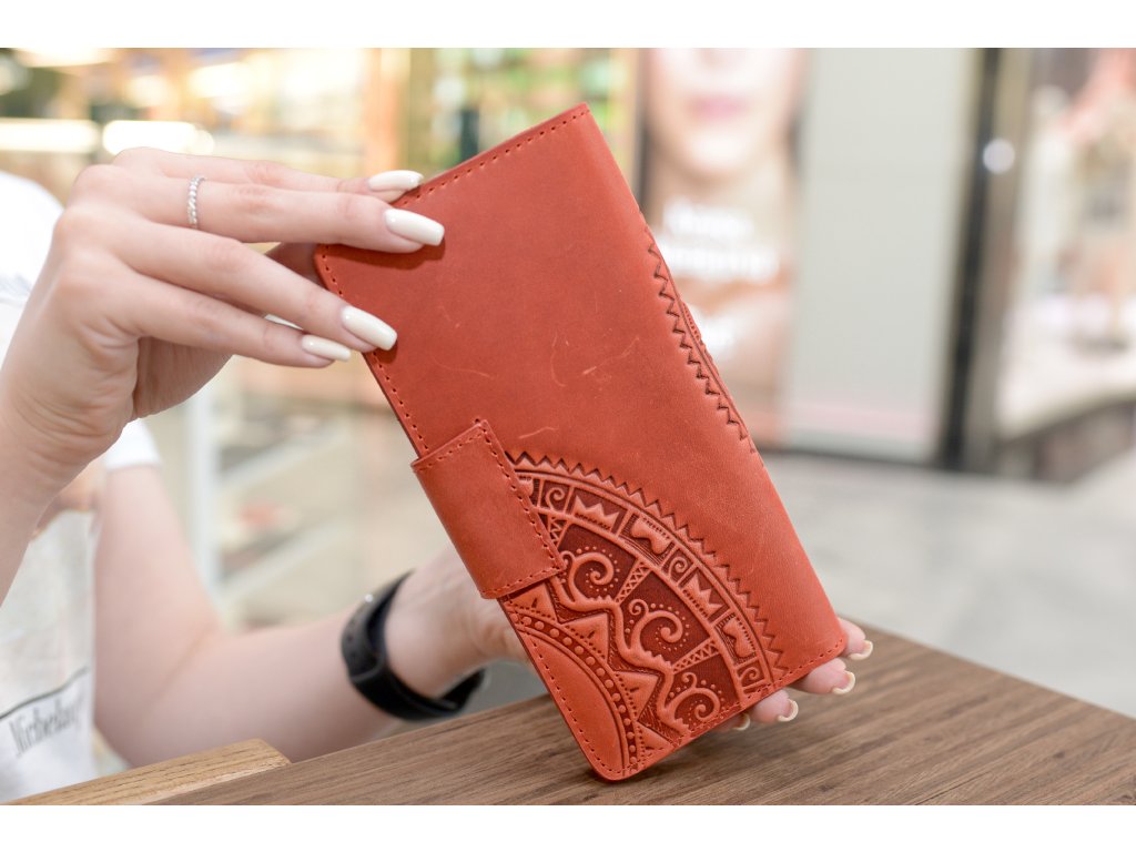 Peněženka-longer "Shpak_M2" s reliéfem "HUCUL". Kůže "Crazy Horse" červená