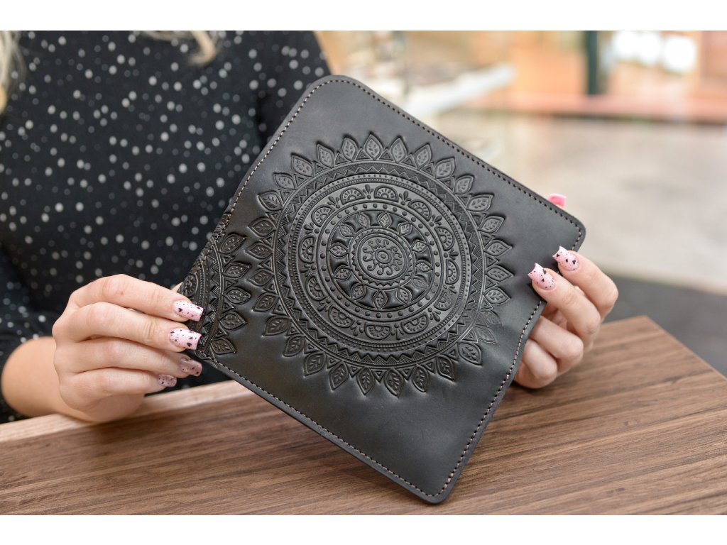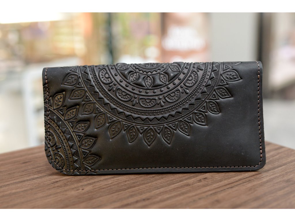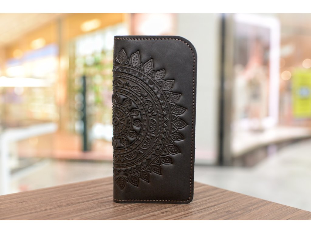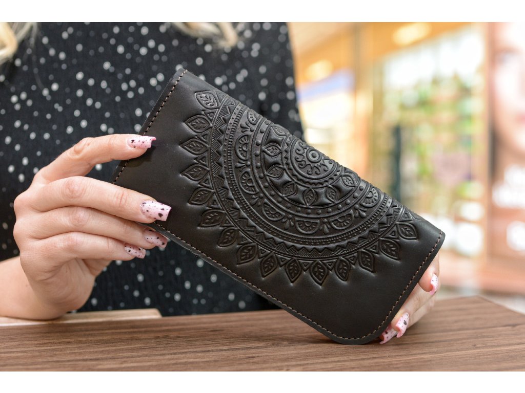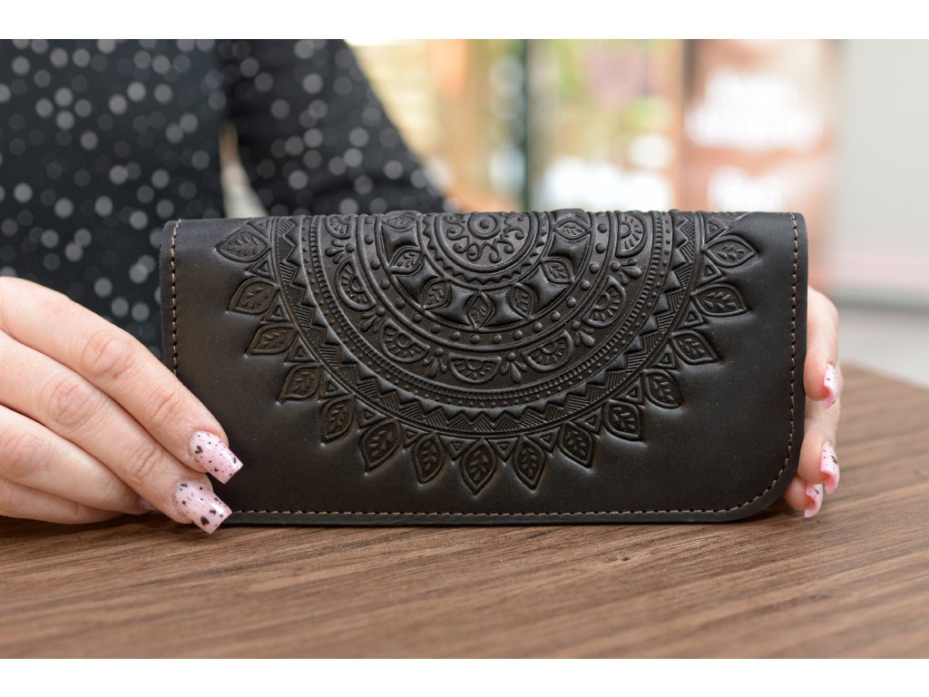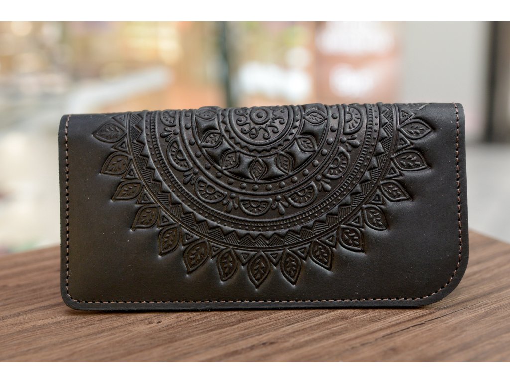 Peněženka-longer "Shpak_M3" s magnety a reliéfem "MANDALA". Kůže "Crazy Horse" černá