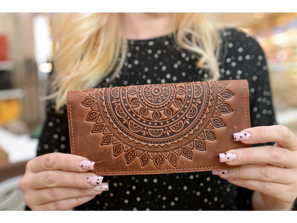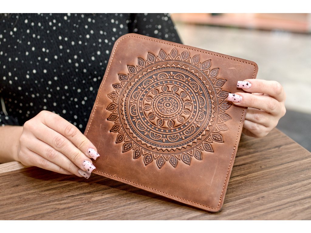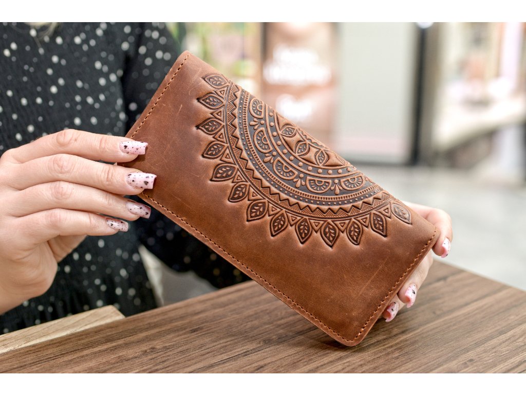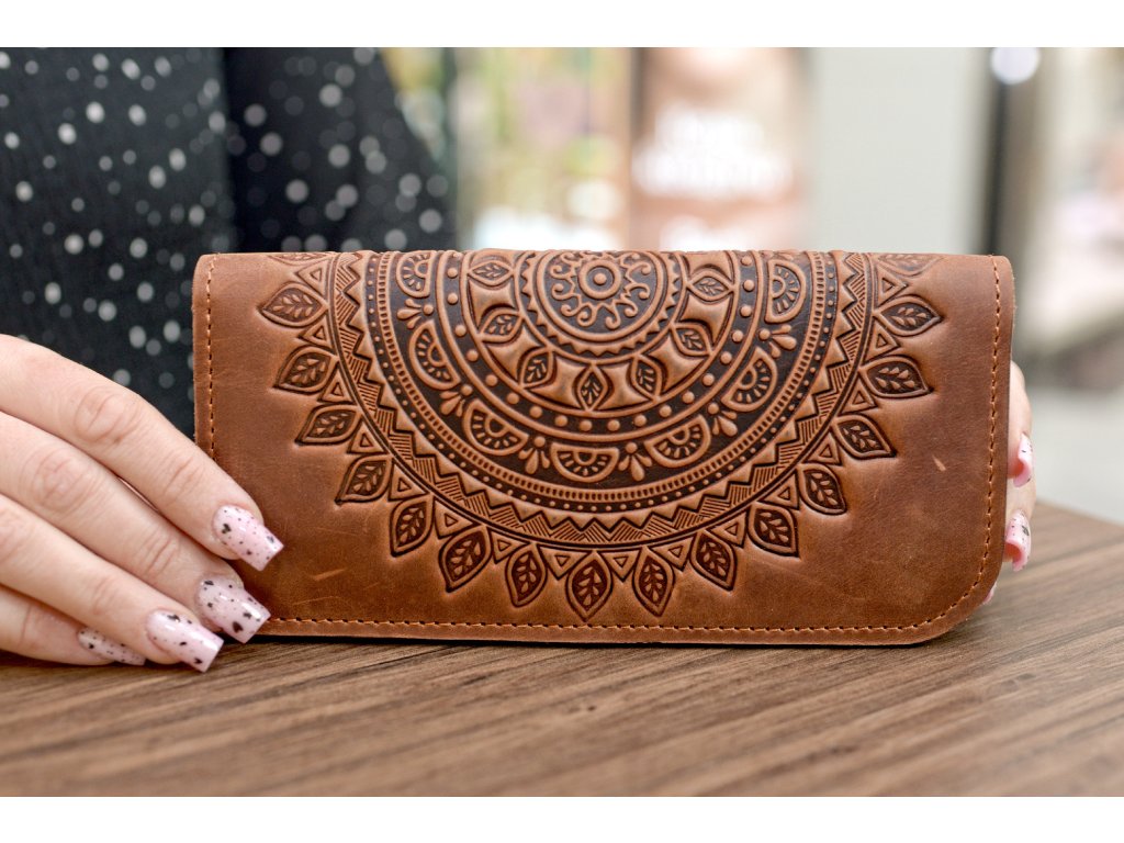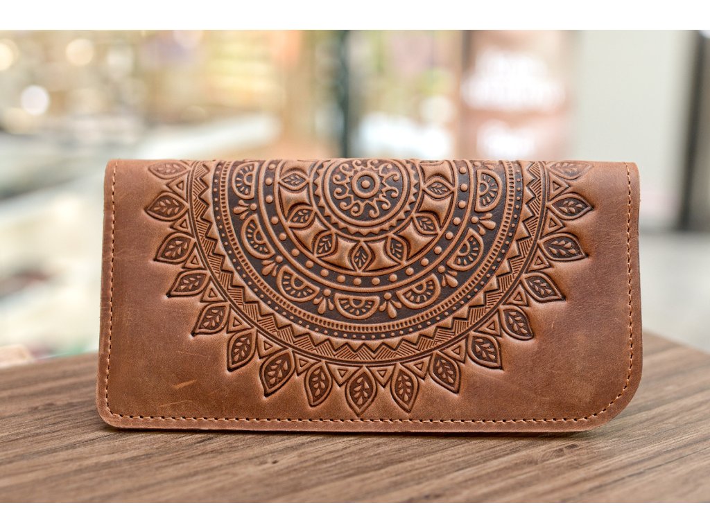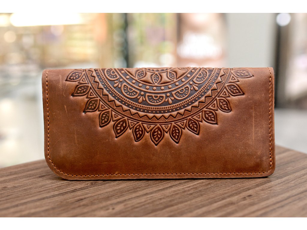 Peněženka-longer "Shpak_M3" s magnety a reliéfem "MANDALA". Kůže "Crazy Horse" rezavá