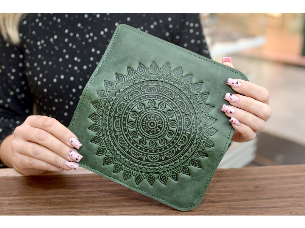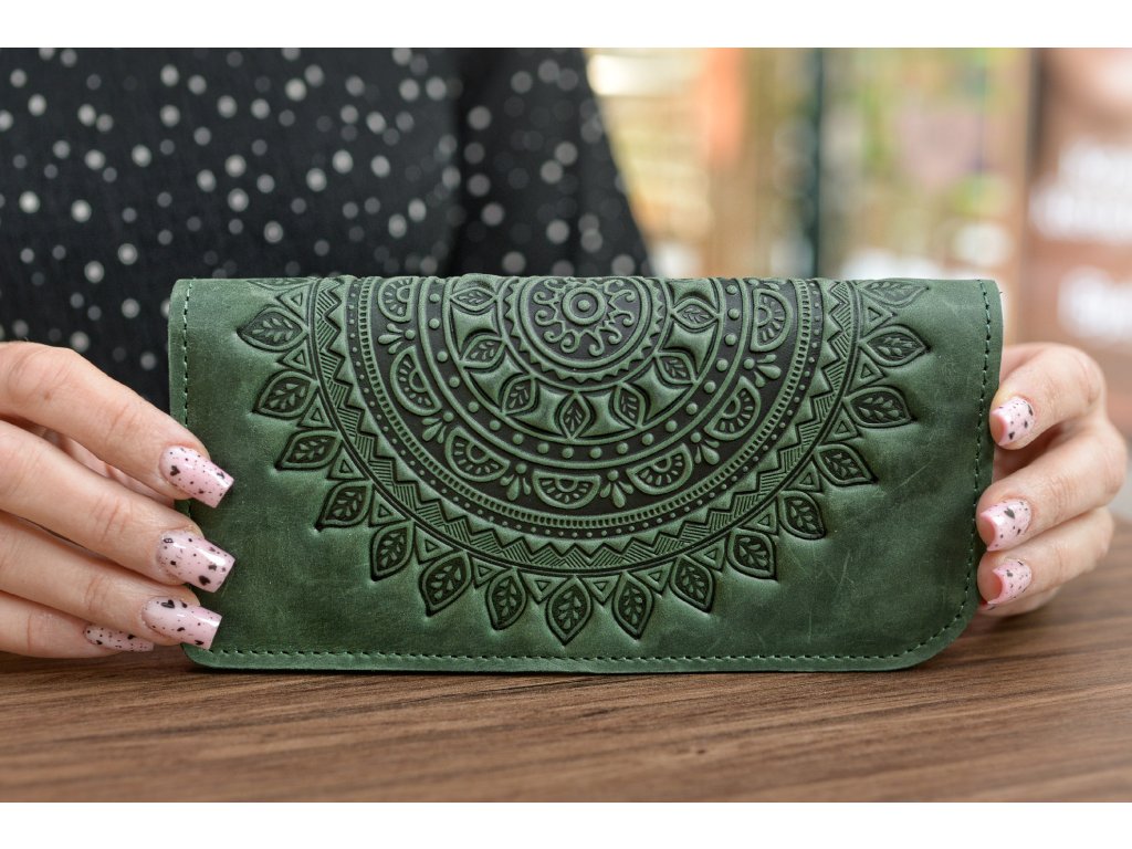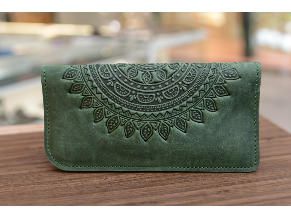 Peněženka-longer "Shpak_M3" s magnety a reliéfem "MANDALA". Kůže "Crazy Horse" smaragdová