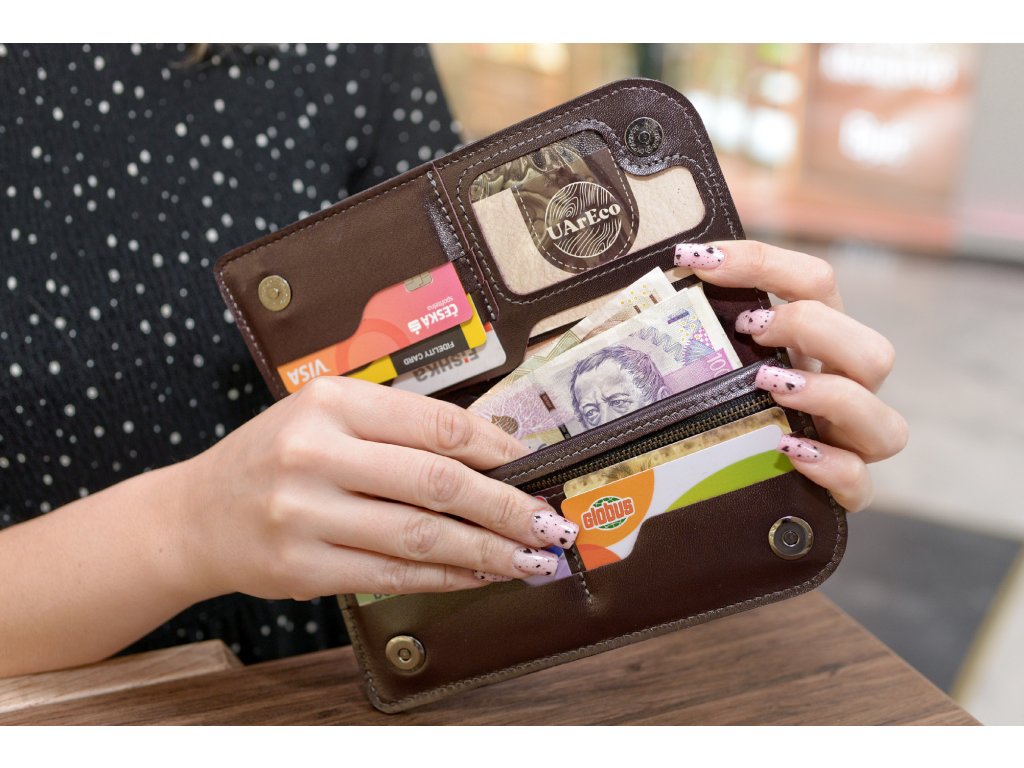 Promyšlené rozvržení kapes umožňuje pohodlně uspořádat bankovky, karty a mince. - Design: