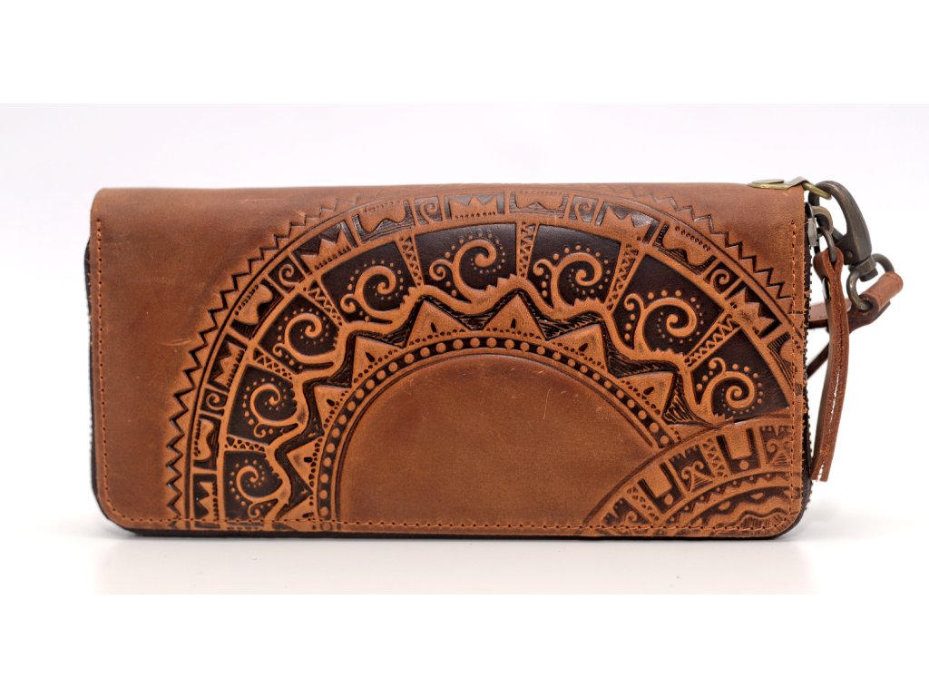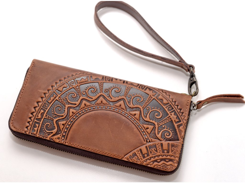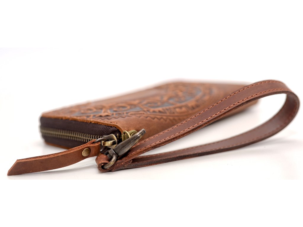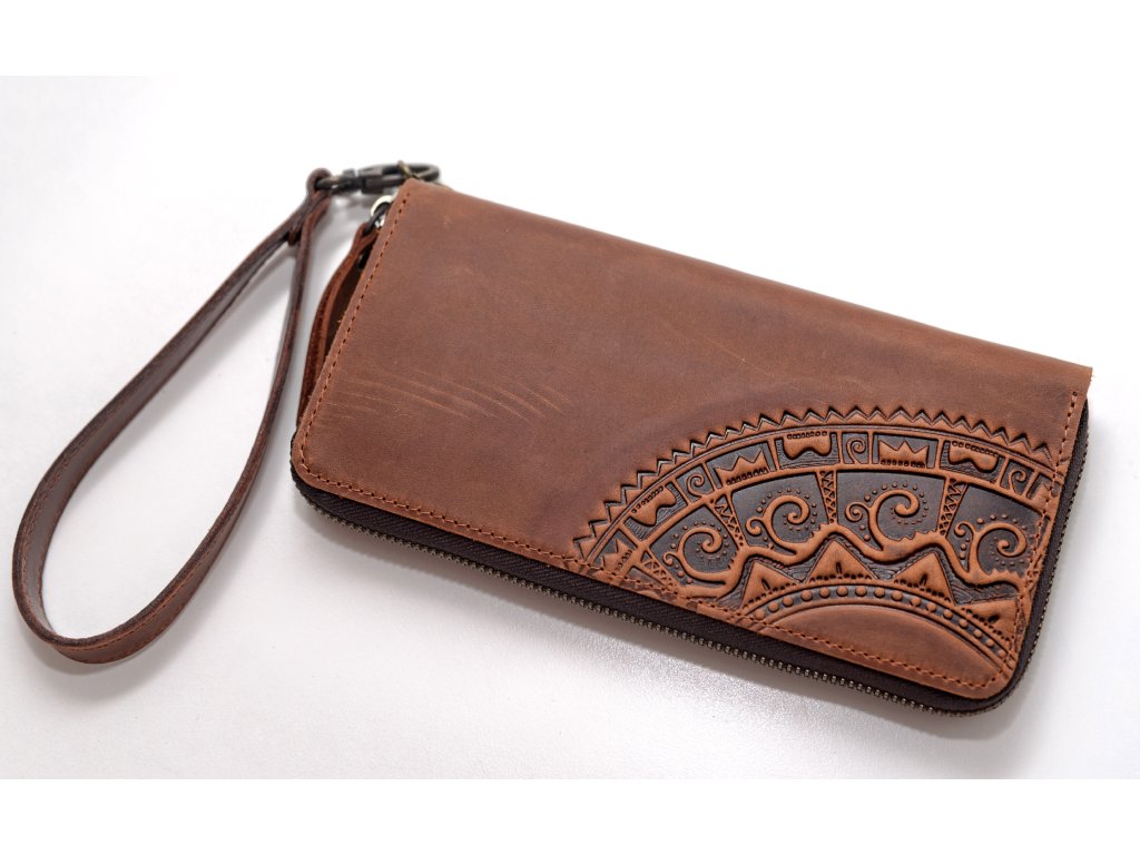 Peněženka velka na zip s reliéfem "HUCUL". Kůže "Crazy Horse" rezavá