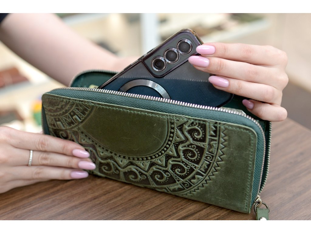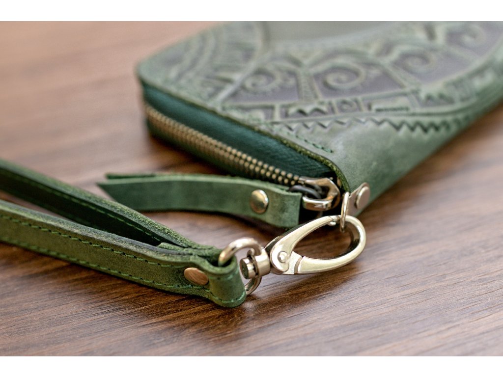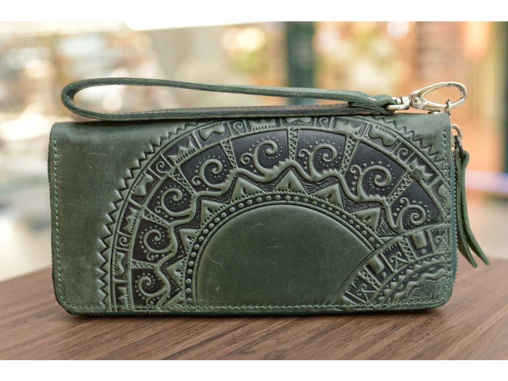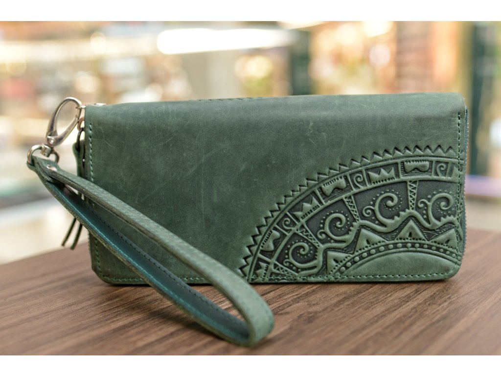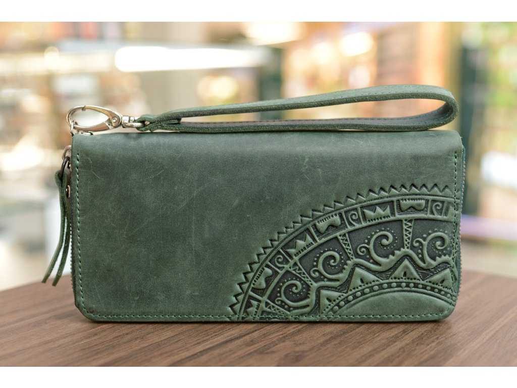 Peněženka velka na zip s reliéfem "HUCUL". Kůže "Crazy Horse" smaragdová