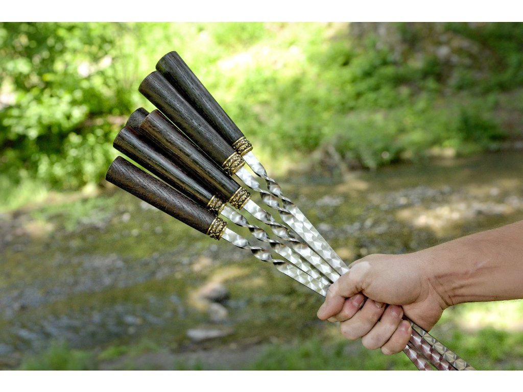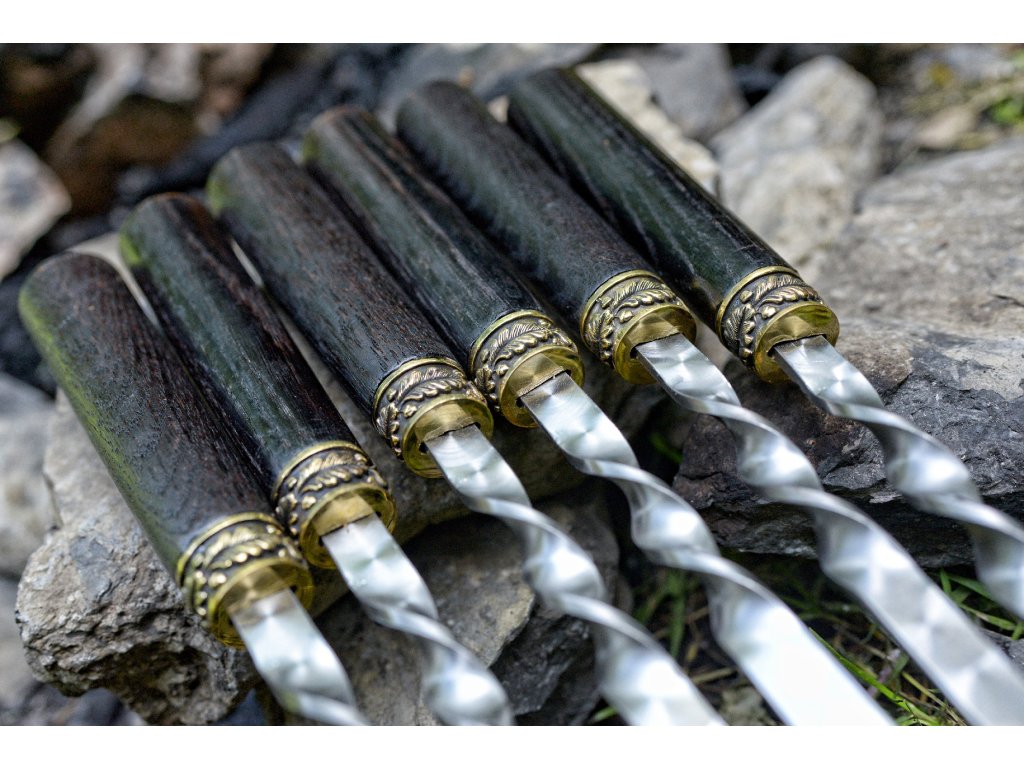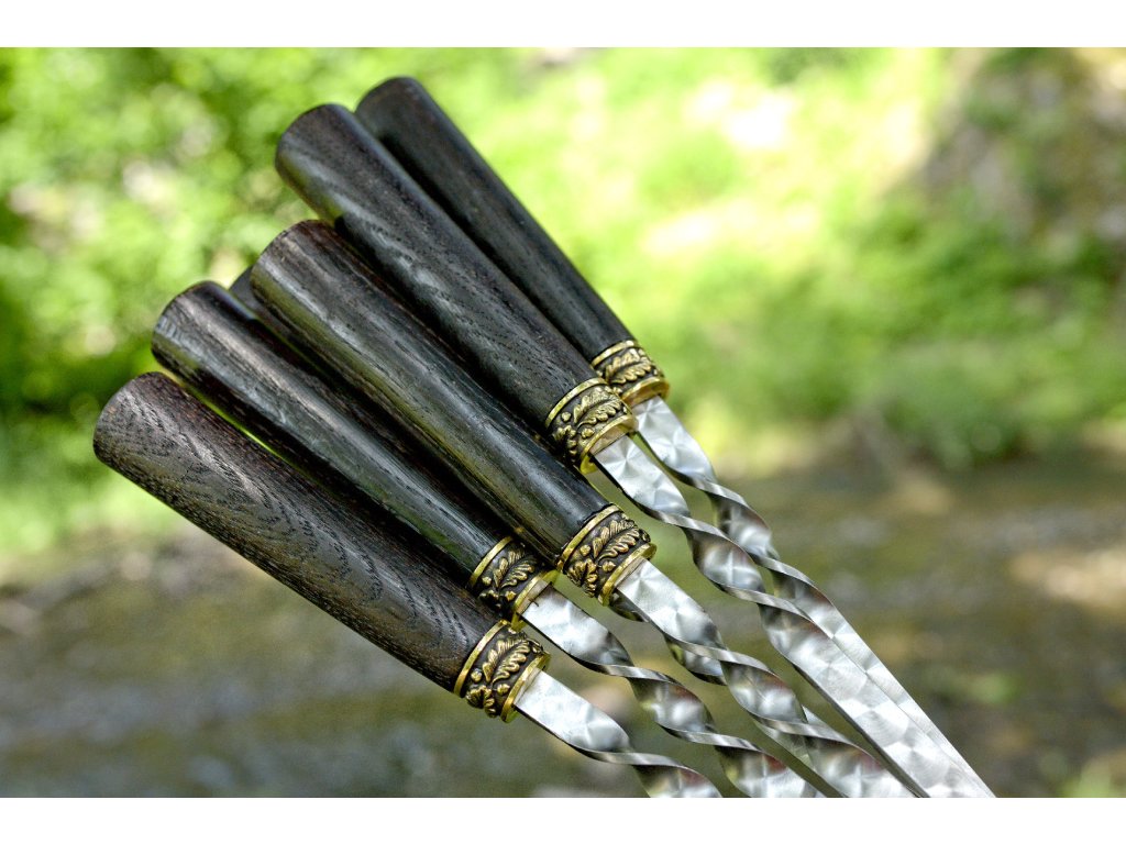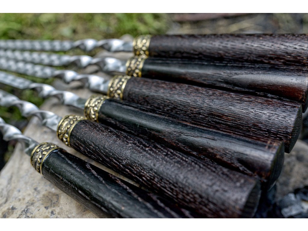 Špízy z nerezové oceli AISI 430 s dřevěnou rukojetí z dubu a dekorativními prvky z cínovaného bronzu jsou ideální volbou pro přípravu šťavnatých kebabů (šašliků). Speciální ostření usnadňuje napichování masa a zeleniny, zatímco leštěný povrch skryje drobné škrábance. Ruční zpracování zajišťuje vysokou kvalitu a detailní provedení. Praktické i elegantní – perfektní pro každé grilování nebo jako luxusní dárek!