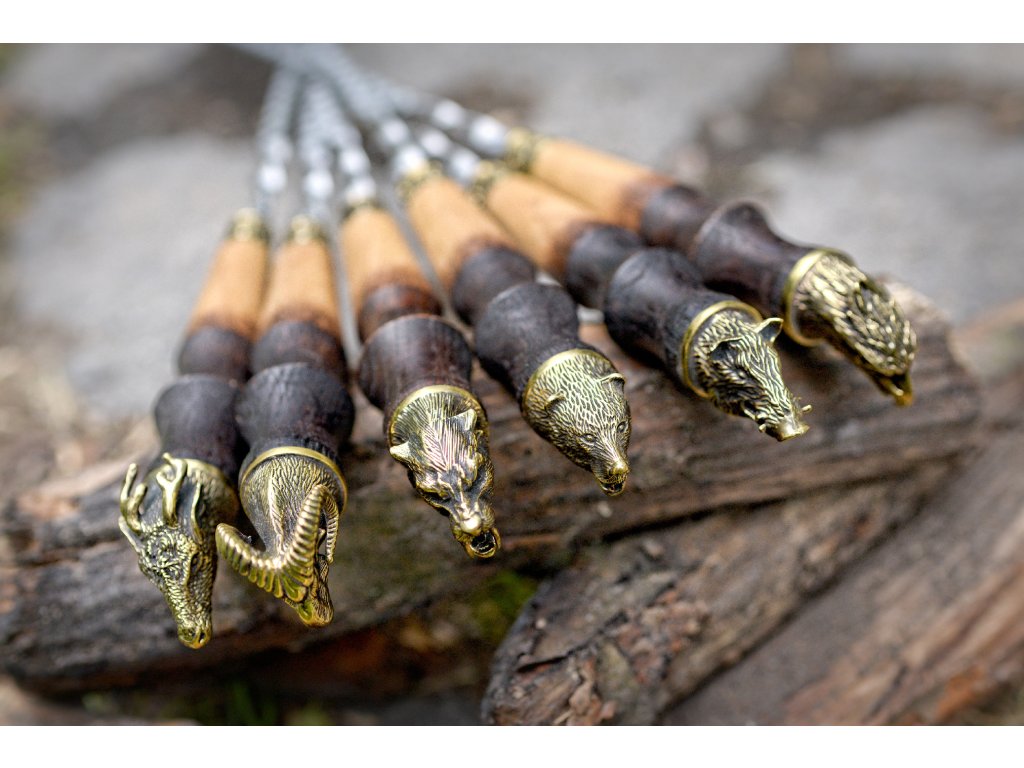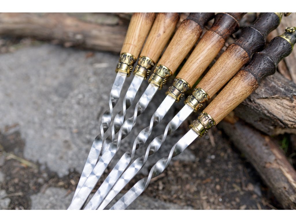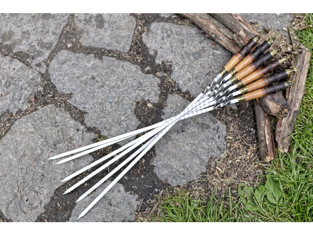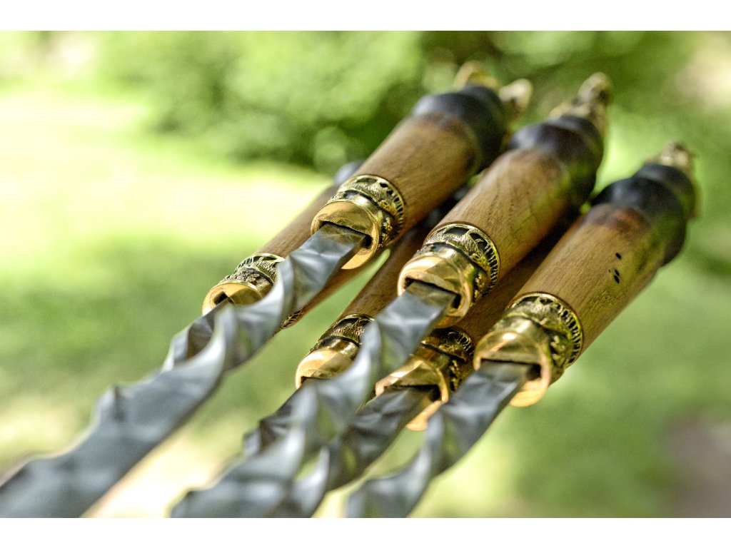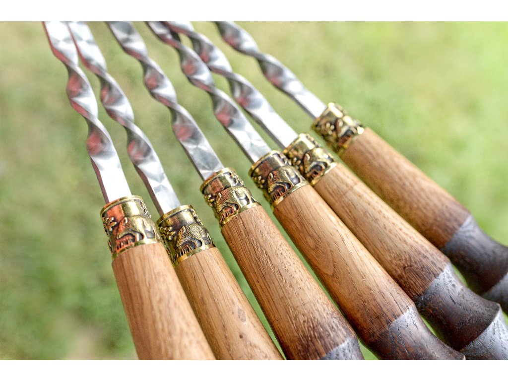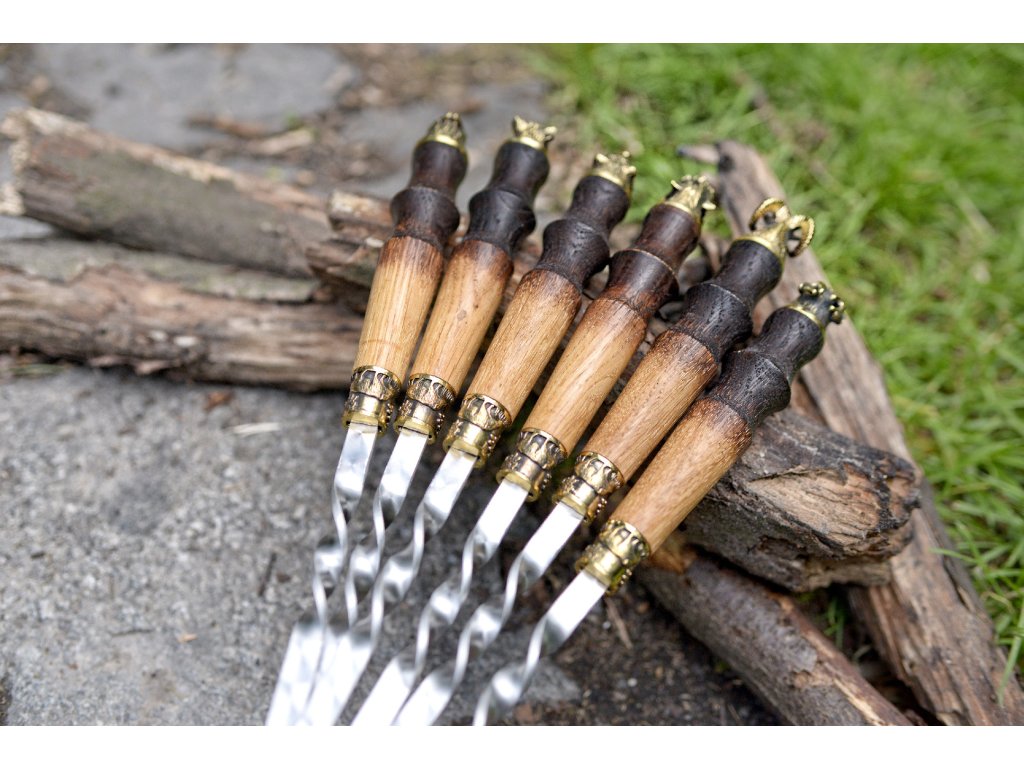 Špízy z nerezové oceli AISI 430 s dřevěnou rukojetí z dubu a dekorativními prvky z cínovaného bronzu jsou ideální volbou pro přípravu šťavnatých kebabů (šašliků). Speciální ostření usnadňuje napichování masa a zeleniny, zatímco leštěný povrch skryje drobné škrábance. Ruční zpracování zajišťuje vysokou kvalitu a detailní provedení. Praktické i elegantní – perfektní pro každé grilování nebo jako luxusní dárek!