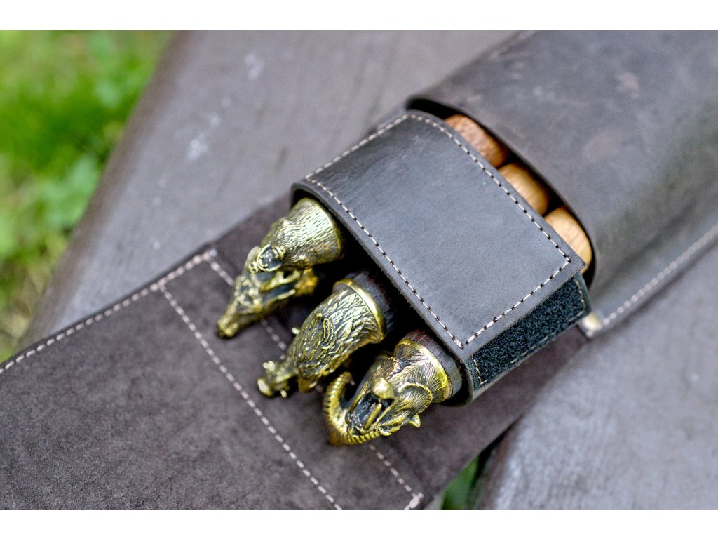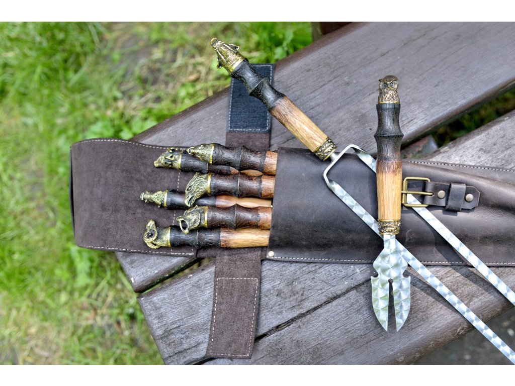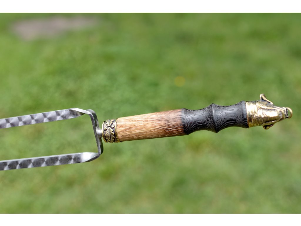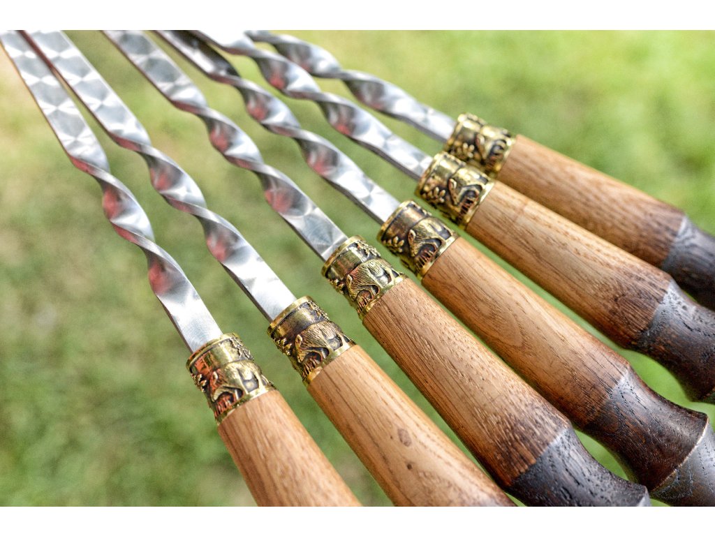 Exkluzivní grilovací sada pro milovníky šašliku – 6 ručně zpracovaných špízů z nerezové oceli AISI 430 s dubovou rukojetí, zdobené bronzovými prvky se zvířecími motivy. Součástí je dvojitý špíz, vidlička a kožené pouzdro z kvalitní hovězí kůže. Elegantní design, vysoká funkčnost a dokonalý dárek pro každého, kdo si potrpí na stylové grilování.