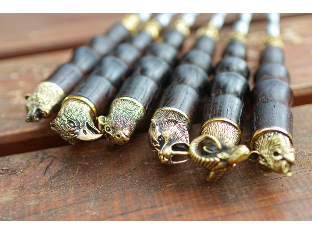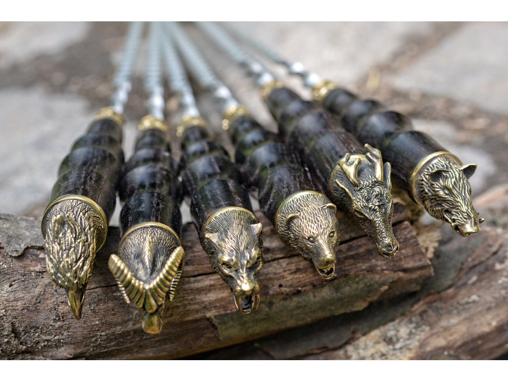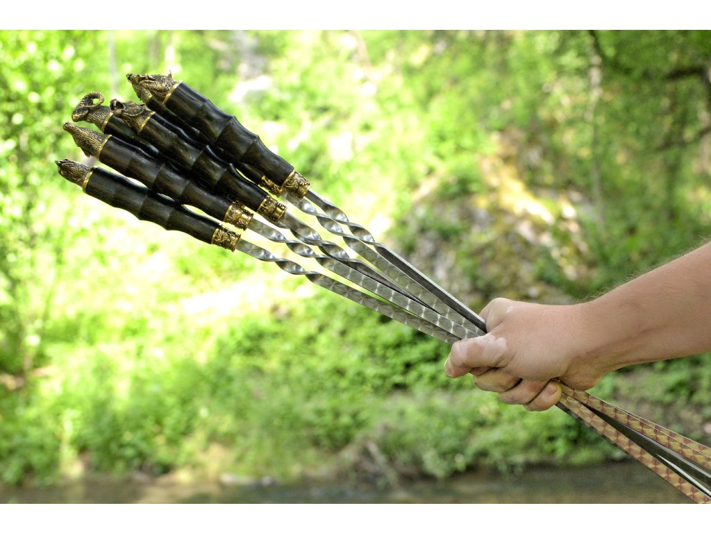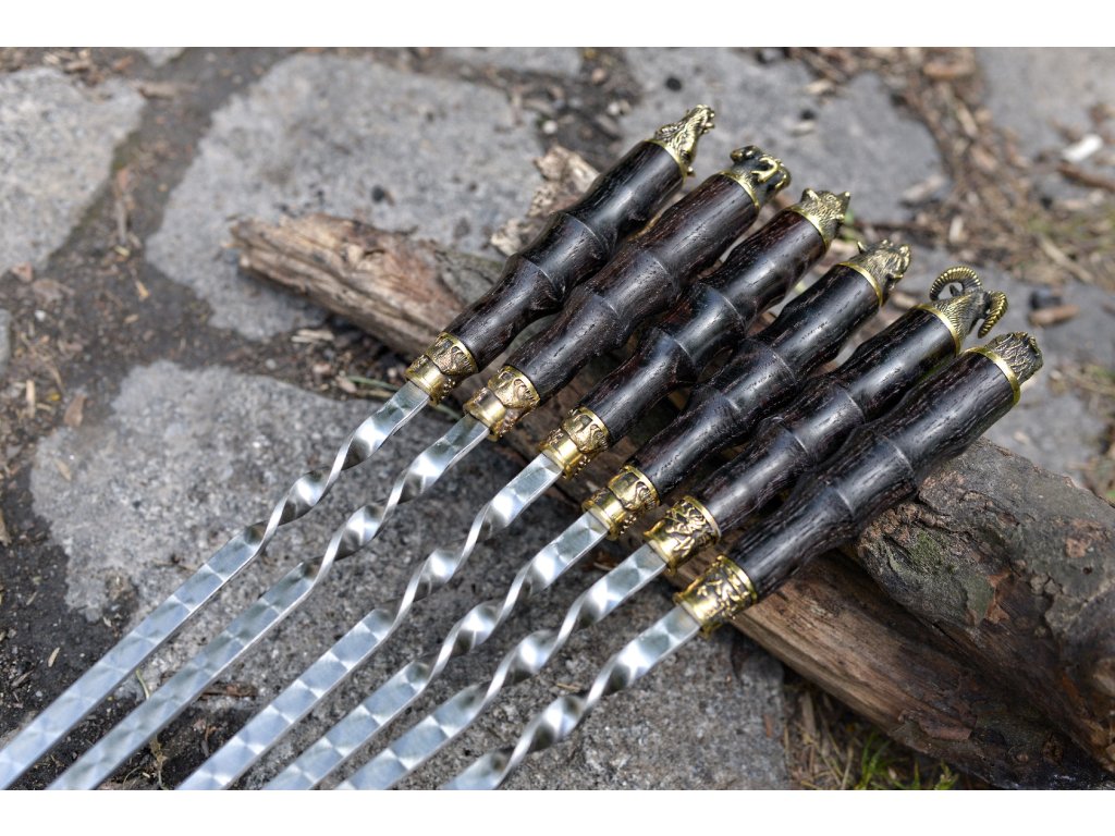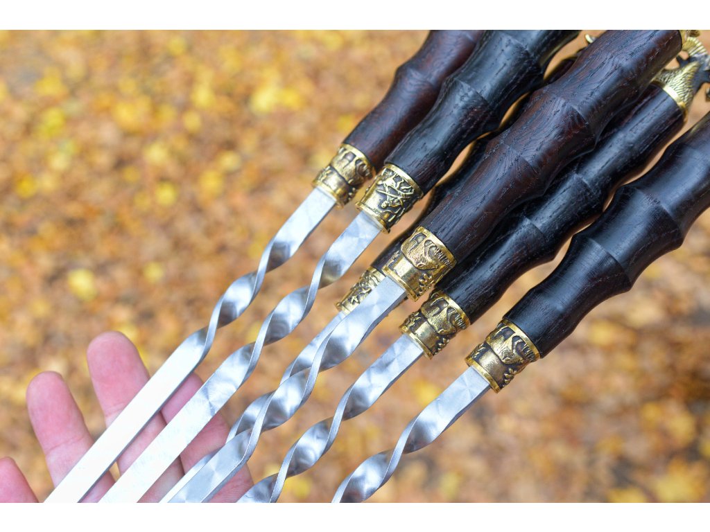 Špízy z nerezové oceli AISI 430 s dřevěnou rukojetí z dubu a dekorativními prvky z cínovaného bronzu jsou ideální volbou pro přípravu šťavnatých kebabů (šašliků). Speciální ostření usnadňuje napichování masa a zeleniny, zatímco leštěný povrch skryje drobné škrábance. Ruční zpracování zajišťuje vysokou kvalitu a detailní provedení. Praktické i elegantní – perfektní pro každé grilování nebo jako luxusní dárek!