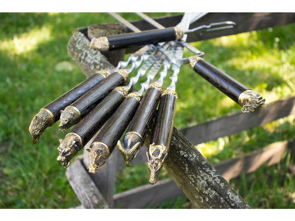 Exkluzivní grilovací sada pro milovníky šašliku – 6 ručně zpracovaných špízů z nerezové oceli AISI 430 s dubovou rukojetí, zdobené bronzovými prvky s motivy zvířat. Součástí je dvojitý špíz, vidlička a kožené pouzdro z kvalitní hovězí kůže. Elegantní design, vysoká funkčnost a dokonalý dárek pro každého, kdo si potrpí na stylové grilování.