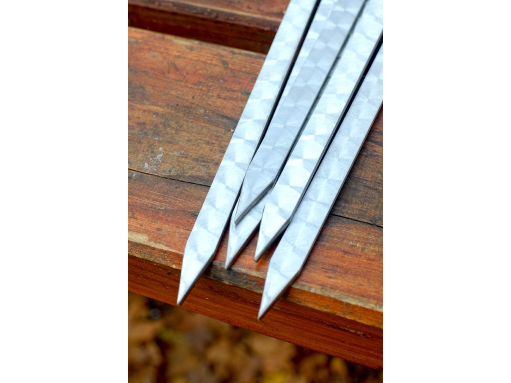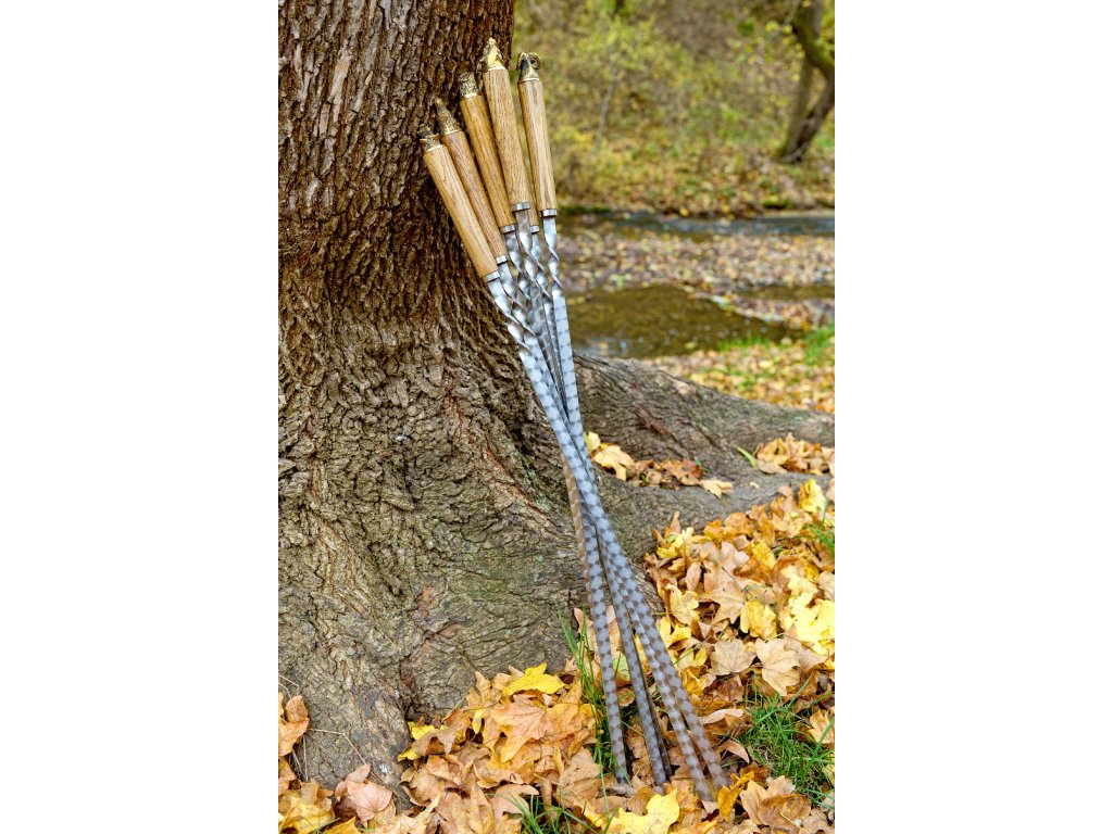 Špízy z nerezové oceli AISI 430 s dřevěnou rukojetí z dubu a dekorativními prvky z cínovaného bronzu jsou ideální volbou pro přípravu šťavnatých kebabů (šašliků). Speciální ostření usnadňuje napichování masa a zeleniny, zatímco leštěný povrch skryje drobné škrábance. Ruční zpracování zajišťuje vysokou kvalitu a detailní provedení. Praktické i elegantní – perfektní pro každé grilování nebo jako luxusní dárek!