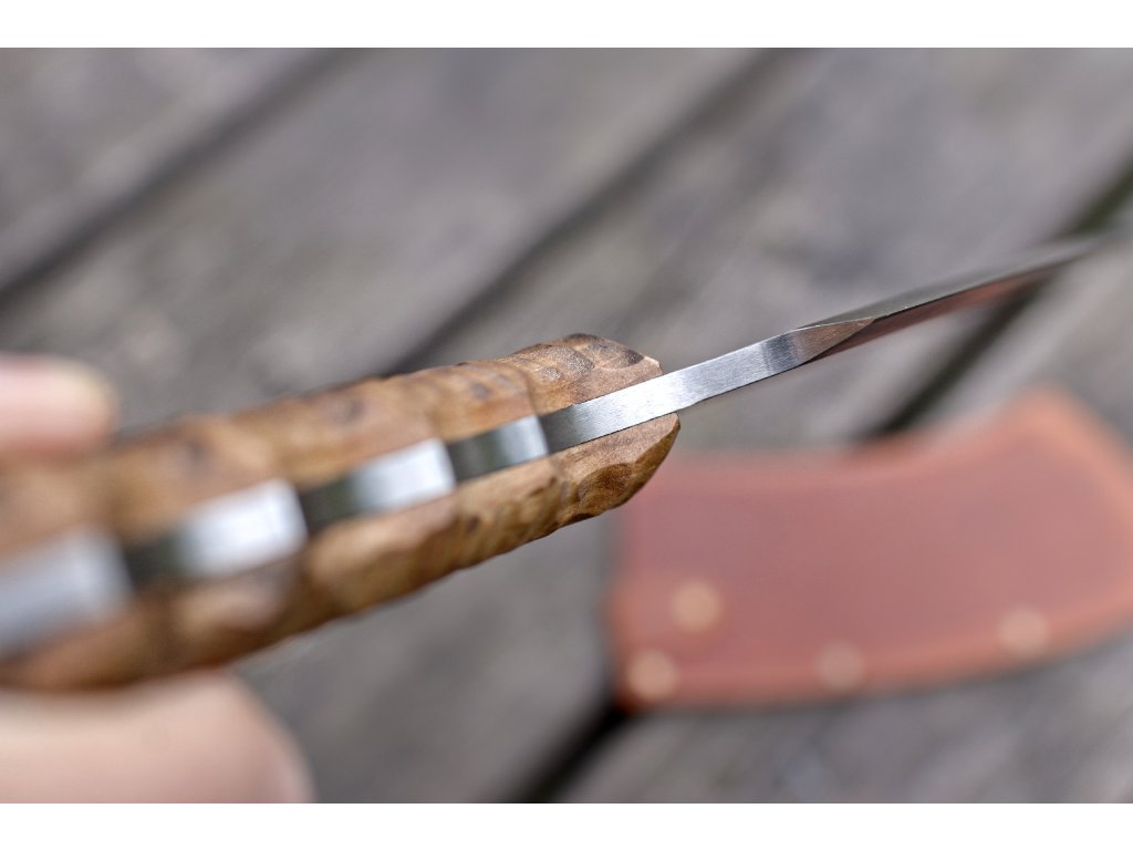 - Konstrukce: Celokovový sekáček s rukojetí z ořechového dřeva, připevněnou dvěma nýty pro maximální pevnost a pohodlí při používání.