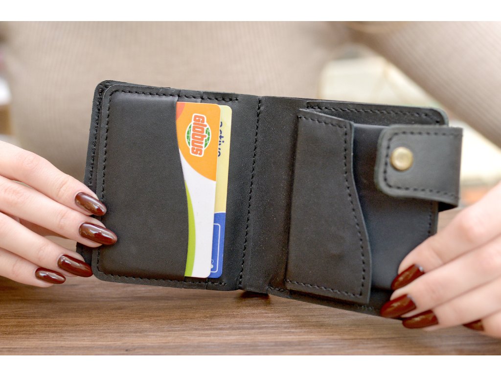 Skladaci čtvercová peněženka s reliéfem "Sovička". Kůže "Crazy Horse" cěrná
