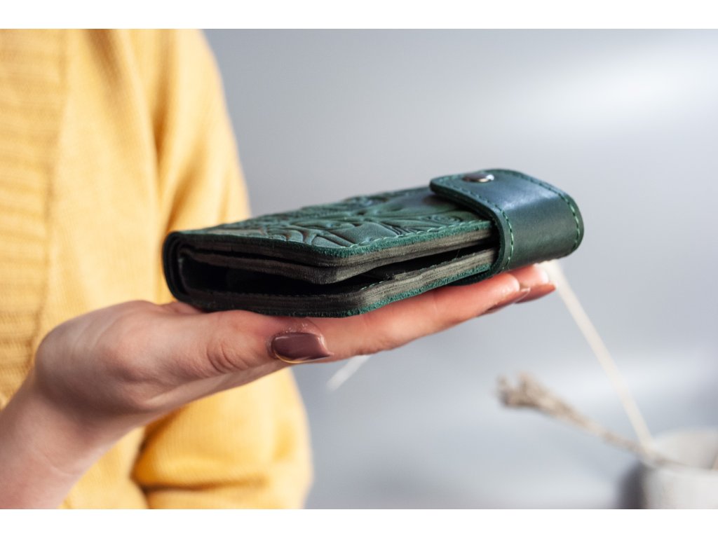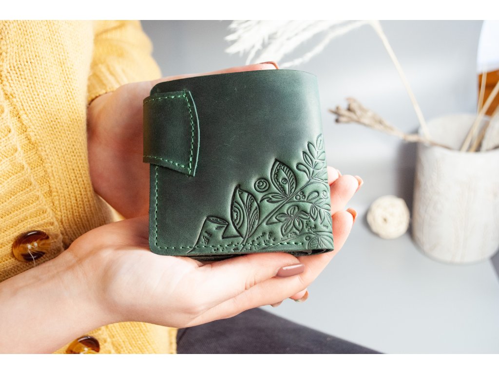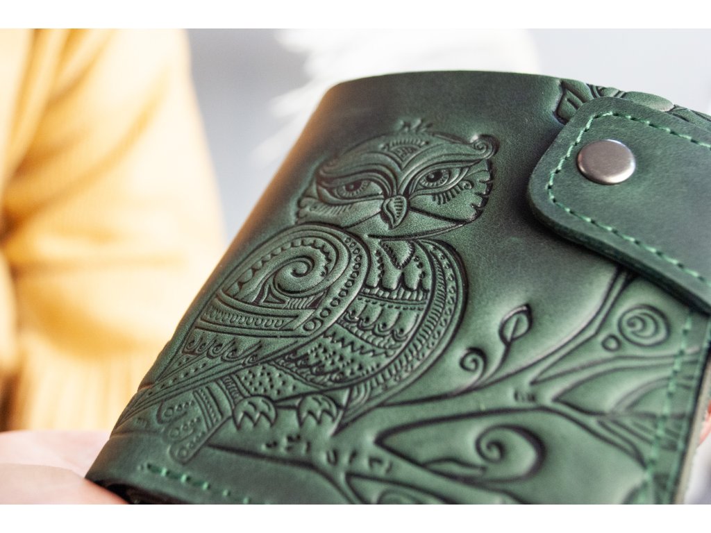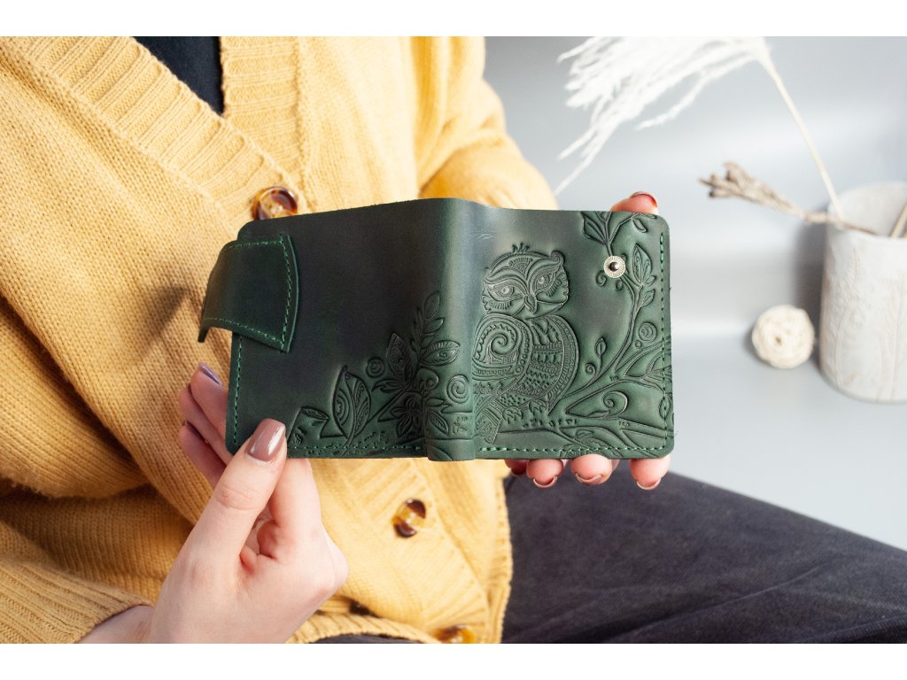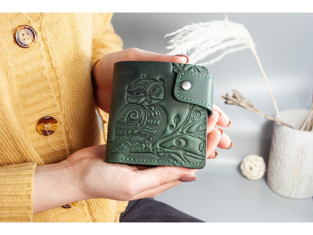 Skladaci čtvercová peněženka s reliéfem "Sovička". Kůže "Crazy Horse" smaragdová