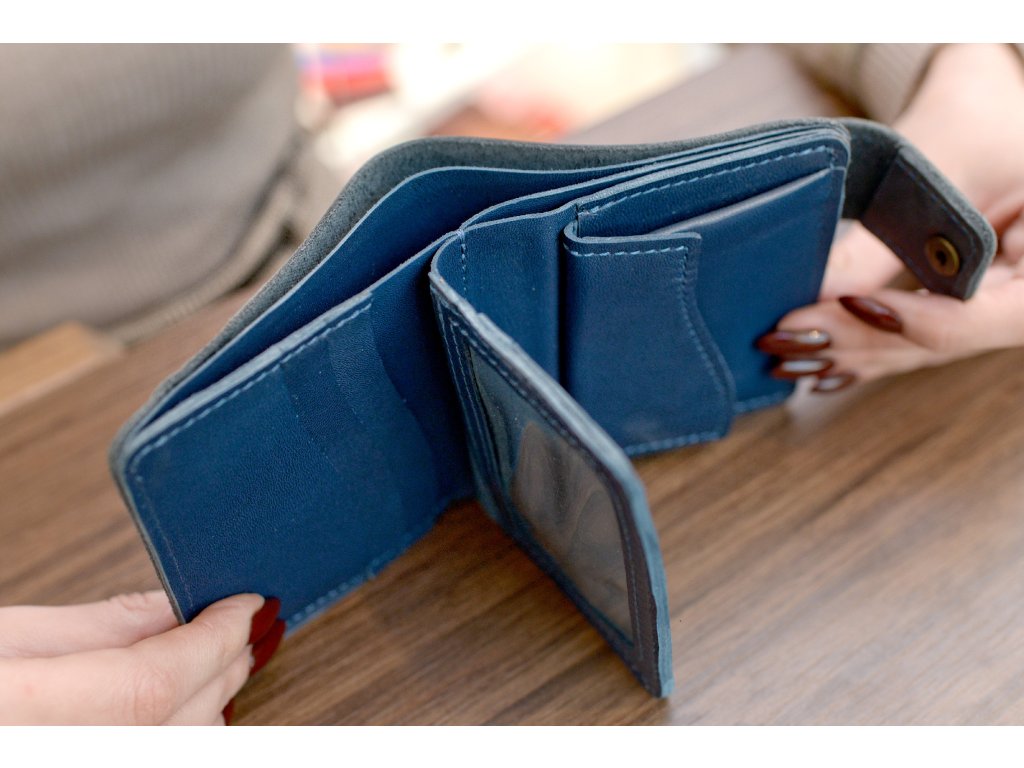 Skladaci čtvercová peněženka s reliéfem "Sovička". Kůže "Crazy Horse" tmavě modrá