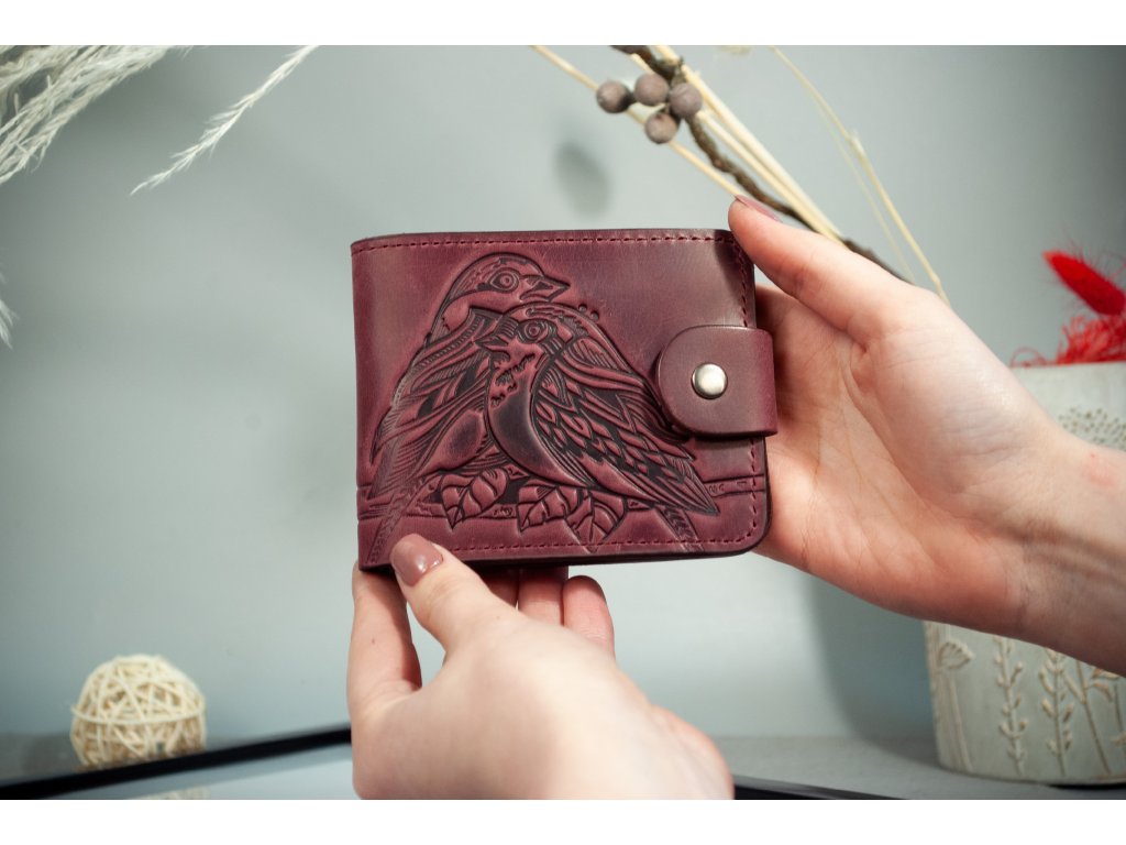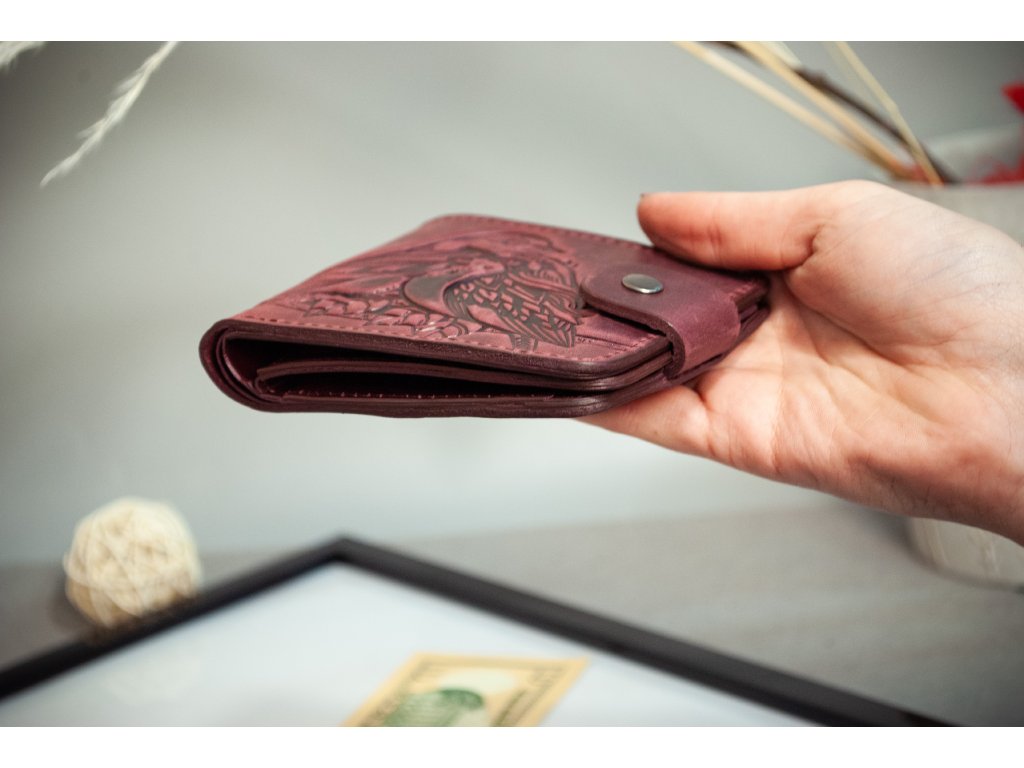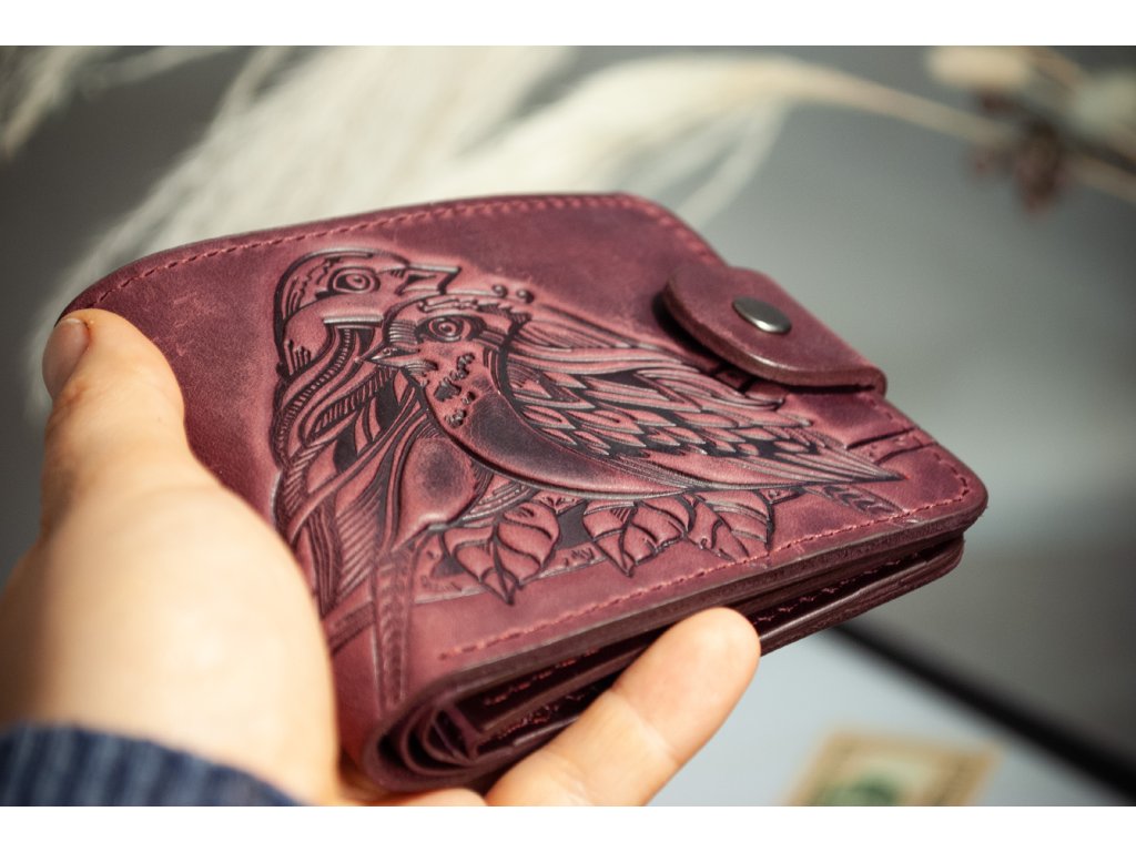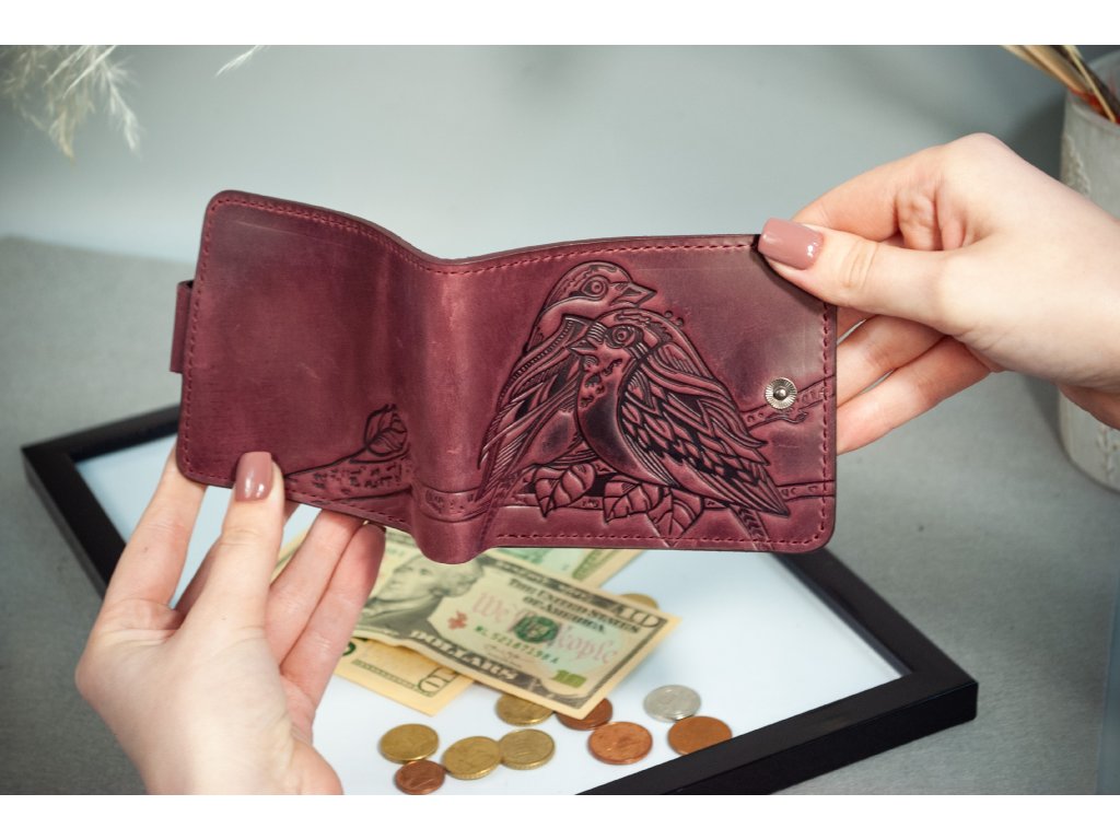 Skladaci peněženka s reliéfem "Ptáčata". Kůže "Crazy Horse" vínová