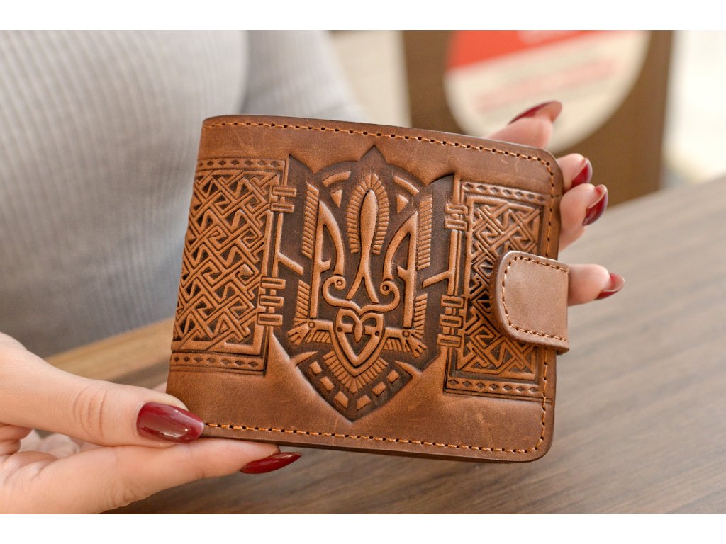 Skladaci peněženka s reliéfem "Trojzubec-výšivka". Kůže "Crazy Horse" rezavá